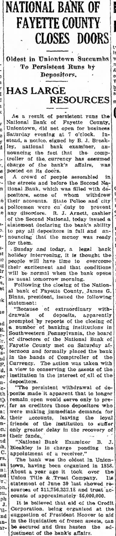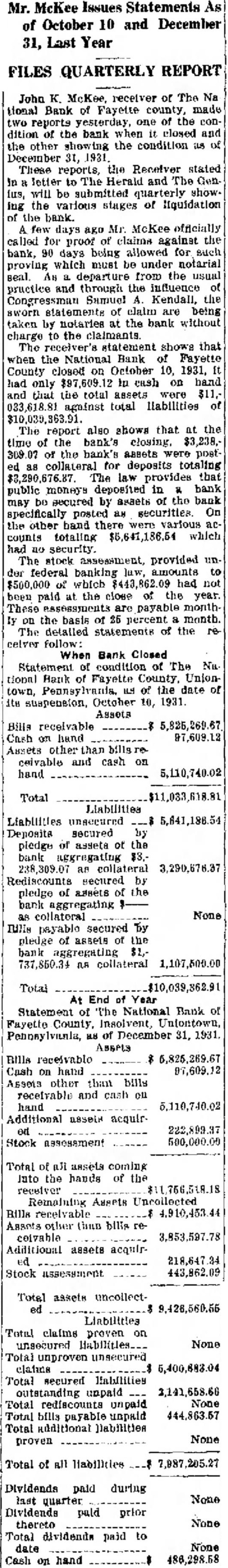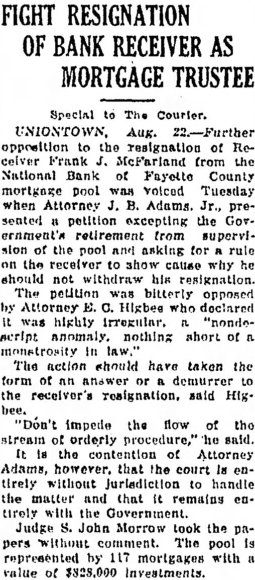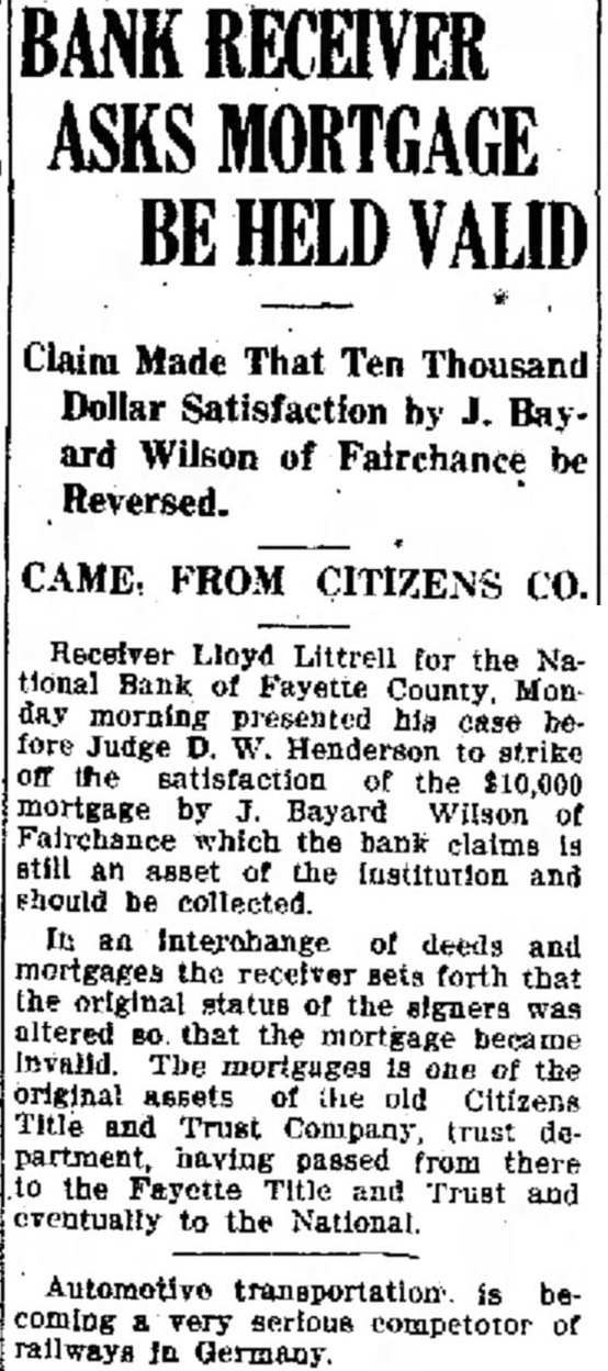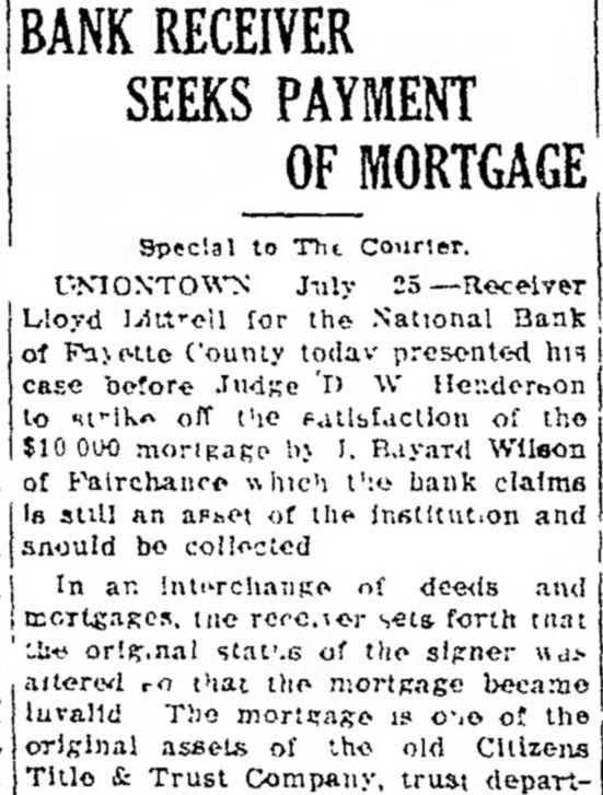 D. SHELBY, HACKNEY & RAY, Attorneys. No. 100 March Term, 1932, Litterell, Receiver The Na. Bank Fayette County YS. Ollie Fa. No. 630 March Term, claim demand the the Fourth Word City of Fayette County, Pennsyl parts of lots Addition Unionthe Pa., in Plan Book. 170, more bounded and defollows: point the WestButler Street feet from Street: Street through No 106, distance of 130 more or twenty thence by line alley point line of No. thirty feet from thence dividing of lots less, to Butler Street: thence by line 23.5 to the place of beginning and RESERVING enal together mining thereto and conveyed BEING the deeds Norris No. January 20, lot and recorded respectively Deed page 135 the Recorder's Office and basement frame dwelling house. Seived and taken execution ns property the National Bank of FuyCounty.