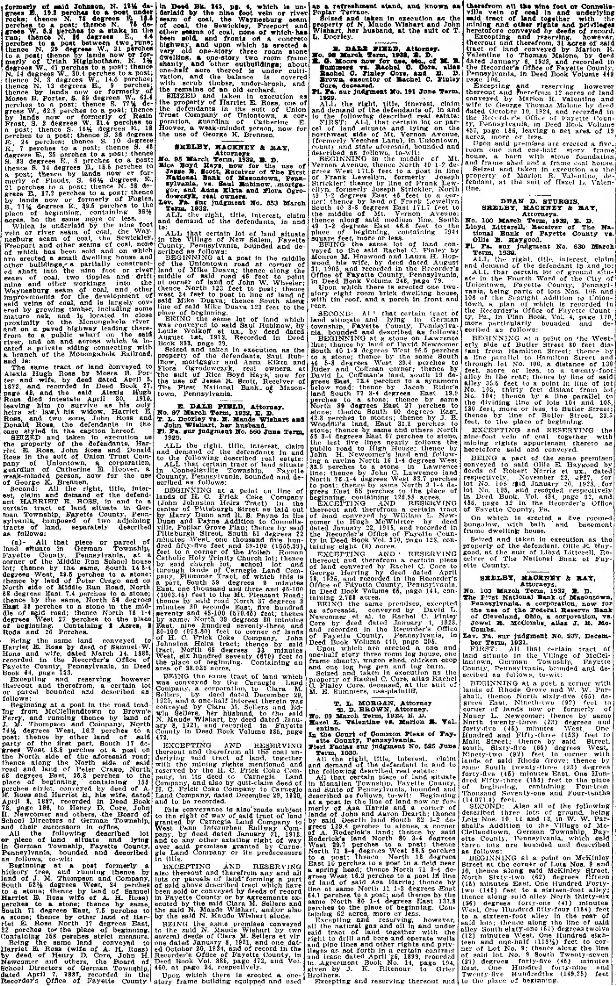 DALE FIELD Attorney. March Term, of Nummers alias Finley Brown, executor of C. Finley Pl. sur judgment No. 191 June Term, 1929. ALL the right, title, claim and described estate: FIRST: that certain lot par(formerly Lane). in Uniontown, county bounded and described middle Mt. grees feet in Frank Lewellyn, Joseph Strickler thence Lewformerly Joseph North feet land Frank degrees to the middle South 46.6 7941 lot land said dated August in the Office Book 246, tin and porch in front and SECOND: that certain tract of and lying township Fayette described follows: South South perches Rider thence David green East 73.4 Rider's land South 77 degrees East North perches South East thence same and North the John ravine North degrees perches to stone thence North post 65 perches the place of and tract land William dated January recorded the Deed page 128, eight (8) AND land convered by Herring the Recorder's Office in Deed Volume page taining the Newcomer Rachel Finley Core by dated January and the Recorder's Office of Book Volume erected and three log house, frame wagon shed, log Core, allas Rachel Core. E.