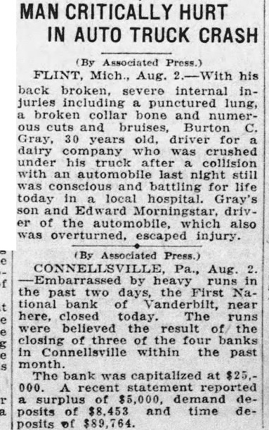 Associated Press.) FLINT, Mich., Aug. 2.-With his back broken, severe internal injuries including punctured lung, broken collar bone and numerous cuts and bruises, Burton C. Gray, 30 driver for dairy was crushed under his truck collision with an automobile last night still was and battling for life today local hospital. Gray's son and Morningstar, driver of the automobile, which also was overturned, escaped injury.