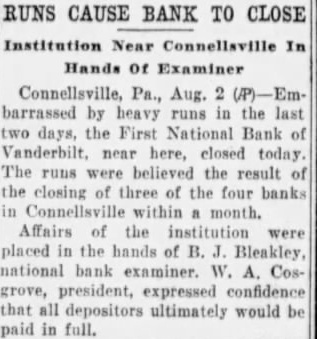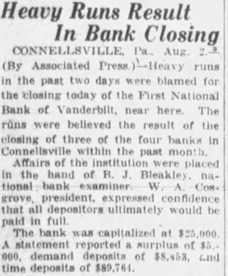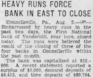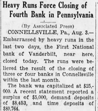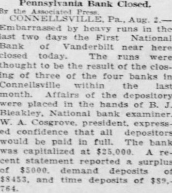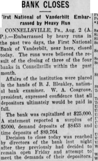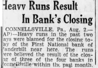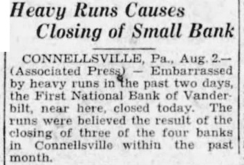 CONNELLSVILLE, Pa., Aug (Associated Press) Embarrassed by heavy runs in the past two days, the First National Bank of Vanderbilt, near here, closed today. The runs were believed the result of the closing of three of the four banks in Connellsville within the past month.