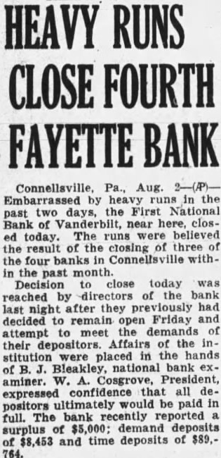 Embarrassed by heavy runs in the past two days, the First National Bank of Vanderbilt, near here, closed today. The runs were believed the result of the closing of three the four banks in Connellsville within the past month. Decision to close today reached by directors of the bank last night after they had decided to remain open Friday and attempt to meet the demands of their depositors. Affairs of the stitution were placed in the hands of B. J. Bleakley, national bank examiner. W. A. Cosgrove, President, expressed confidence that all depositors ultimately would be paid in full. The bank recently reported surplus of $5,000; demand deposits of $8,453 and time deposits of $89.764.