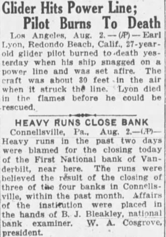 Glider Hits Power Line; Pilot Burns To Death Los Angeles, Aug. Earl Redondo Beach, Calif., glider pilot burned terday when ship snagged power and afire. The was about feet the when struck the Lyon died flames before he could be rescued.