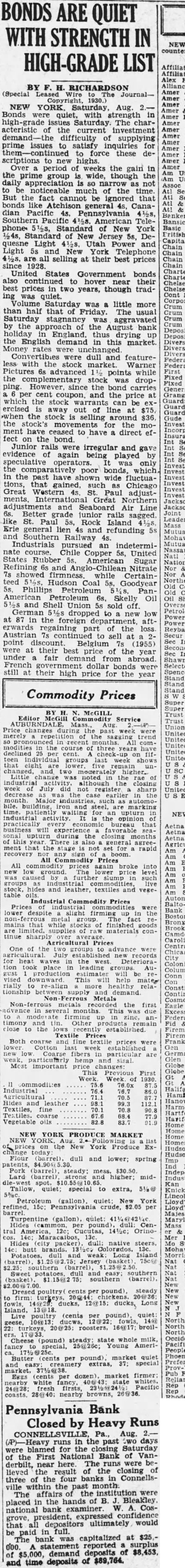 BY F. H. RICHARDSON (Special Wire Journal NEW YORK. Saturday, Aug. Bonds with strength in Saturday The characteristic of current investment demand the difficulty of supplying prime issues to satisfy inquiries for them- to force these descriptions to highs Over of the gain in the prime group is wide, though the daily appreciation is so narrow to be noticeable of the time. But the fact cannot be ignored that bonds like Atchison general 4s, Canadian Pacific Pennsylvania phone Standard of New York 1/24s, Standard of New 5s, Dequesne Light 41/28, Utah Power Light 5s and New York Telephone 4½S, are all selling at their best prices since 1928. United States Government bonds also to near their best prices in two years, though trading was Volume Saturday was a little more than half that of Friday. The usual Saturday stagnancy was aggravated by the approach of the August bank holiday in England. thus drying up the English demand in this market. rates Convertibies were dull featureless with the stock market Warner Pictures 6s advanced 1½ points while the complementary stock was dropping. However, since the carries per cent coupon and the price at which the stock can be ercised is away out line at when the stock is selling $36 the stock's for the moment have ceased to have a direct effect on the Junior rails were irregular and gave evidence of again being played by speculative was only the comparat poor bonds, which in the past have shown wide fluctuations, that gained, such as Chicago Great Western 4s. St. Paul adjust ments International Great Northern Seaboard Air Line 6s. Better grade junior rails like St. Rock Island Erie general and refunding 5s and Southern Railway 4s. Industrials pursued an indeterminate course. Chile Copper 5s, United States American Sugar Refining 6s and Anglo Chilean Nitrate 7s showed firmness while Certainteed Hudson 5s, Goodyear 5s, Phillips Petroleum PanAmerican Petroleum 6s, Skelly Oil 1/28 and Shell Union 5s sold off. dropped to new low at 87 in the department, afterwards regaining part of the loss. Austrian 7s to sell at point Belgium (1955) were at their best price of the year under fair demand from abroad. French government dollar bonds were still at their high price for the year