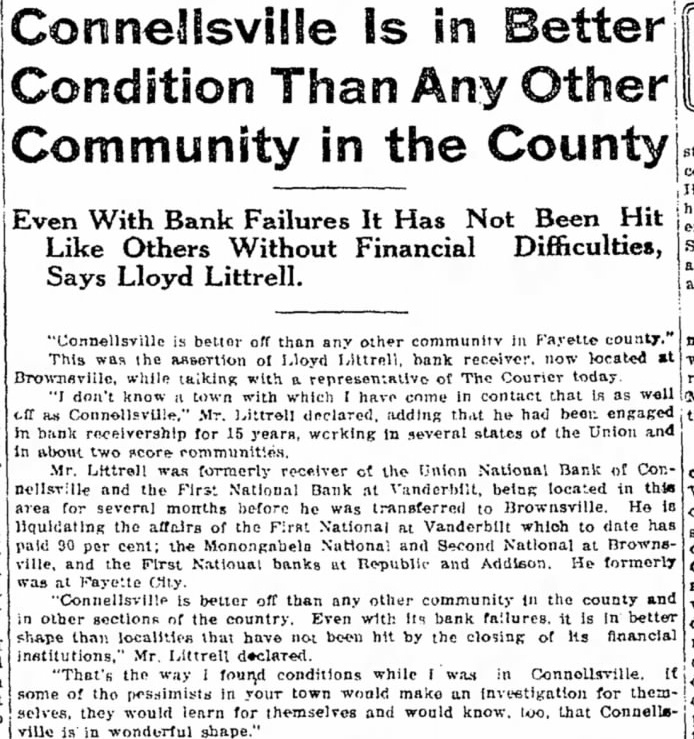 "Connellsville better off than other community in county.' This the assertion of Lloyd Littrell bank receiver. now located while taiking with representative The Courier today don't know town with which have contact that Mr. Littrell adding that he had engaged ty. in bank receivership for years, working in several states of the Union about two Littrell formerly receiver of the Union National Bank of and the First National Bank being located in this area for before transferred Brownsville the affairs of the First National Vanderbilt which to date has paid 30 cent; the National and Second National Brownsper the National banks Republic and Addison. He formerly City better off than other community in the county and any other sections of the Even Its bank better shape localities that have not been hit by the closing of financial Mr declared "That's the found conditions while If way some of the would an for themselves, they would learn for themselves and would know. 100, that Connellsville wonderful shape."