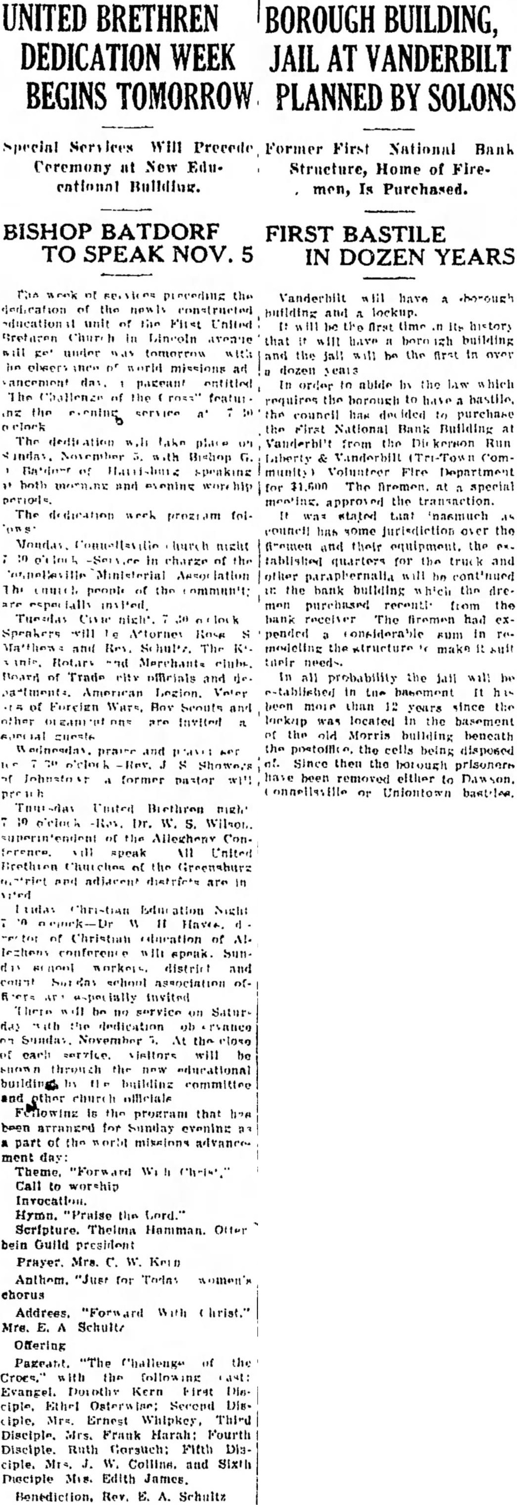 BISHOP BATDORF TO SPEAK the dedication the constructed unit First United will under tomorrow world missions The Challenge of the the The place and evening periods. The dedication in charge Ministerial people of the community Tuesday Speakers will Miorney Rev. The Board of Trade rity officials and American Veter Foreign and other Invited and Showers former the Allegheny Con. speak United Brethien of the Greensburg and adjacent districts are in Ltudas Christian Night conference district and count school association ofday the dedication Sunday, November At each will be suown through the educational buildings building committee and other the program that has been arranged for Sunday evening part of the world missions advance ment day: Theme. Call to worship Hymn. the Cord." bein Guild president Prayer. Mrs. C. W. Kein for women's chorus
