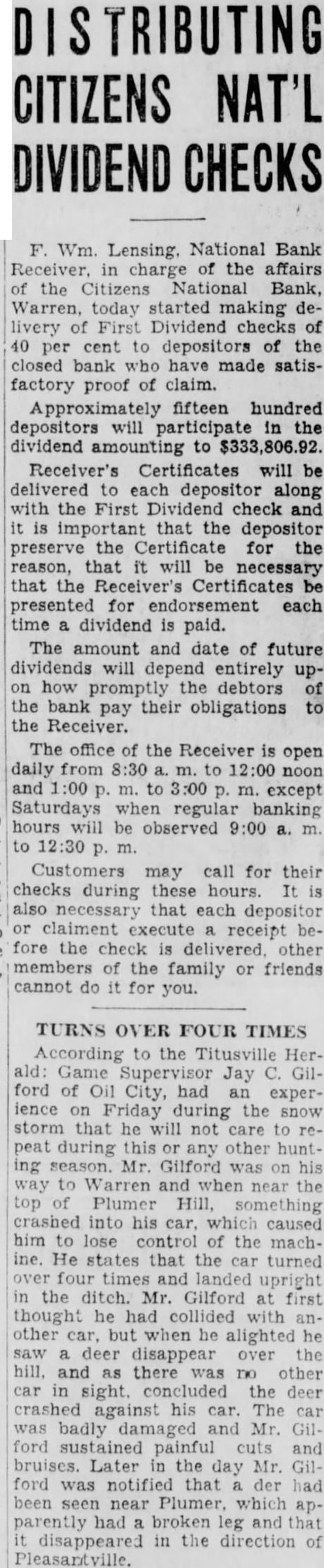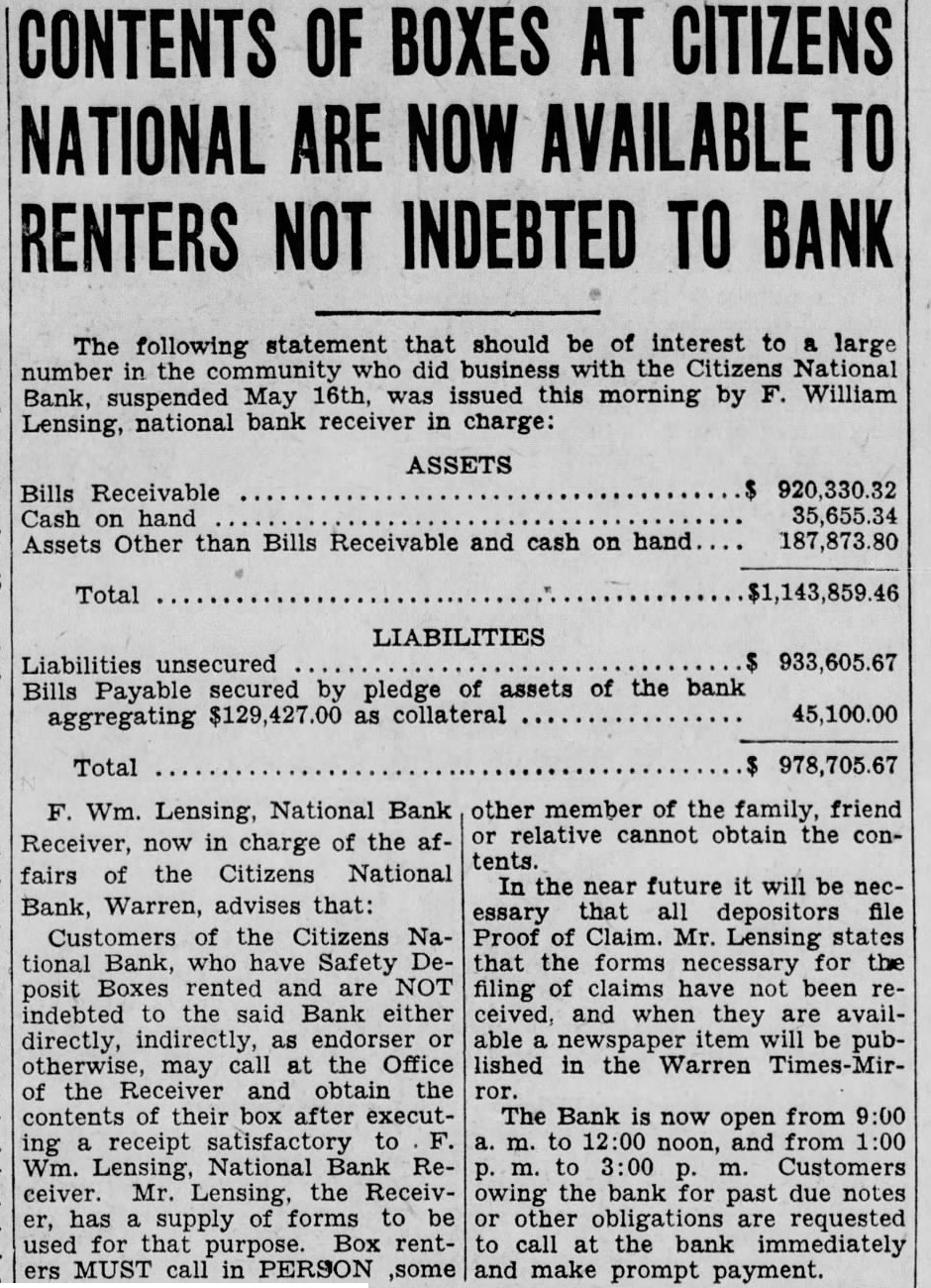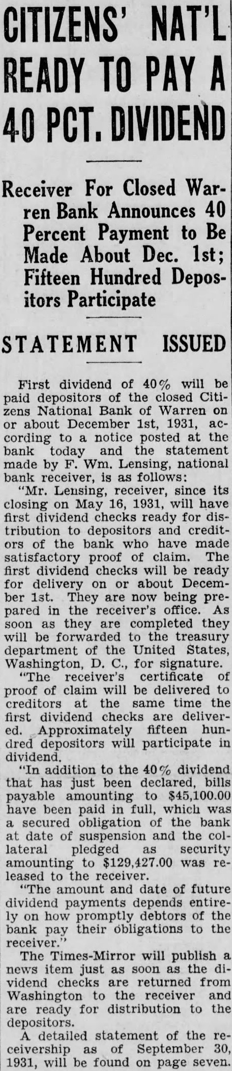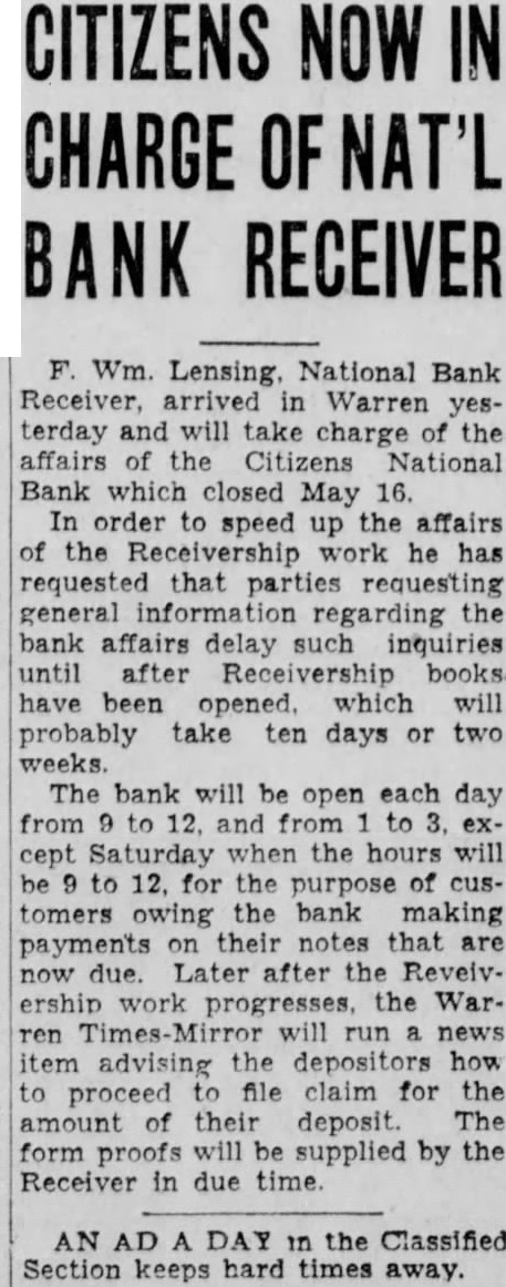 MUST FILE CLAIMS Mr. Lensing, National Bank Receiver in charge of the affairs of the Citizens National Bank, states that it is necessary for each depositor of the Citizens National Bank to file a claim with the Receiver before the depositor will participate in dividends. All depositors of said bank should promptly call at the bank and file their claims. The necessary proof forms will be supplied by the Receiver. Each depositor should present his pass book or other evidence in order to establish the claim. Depositors who fail to file claim with the Receiver will not participate in dividends.