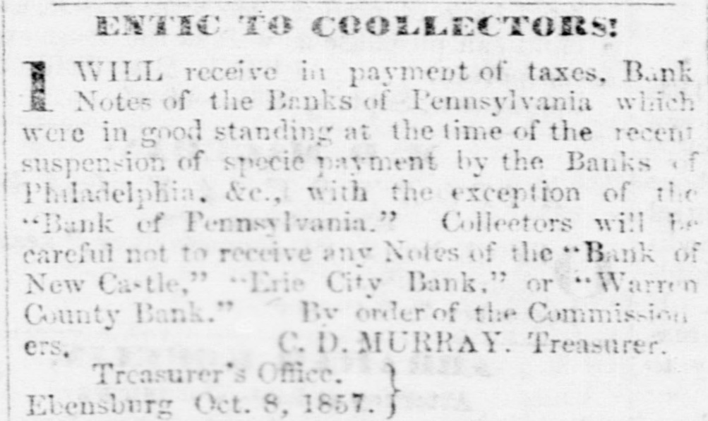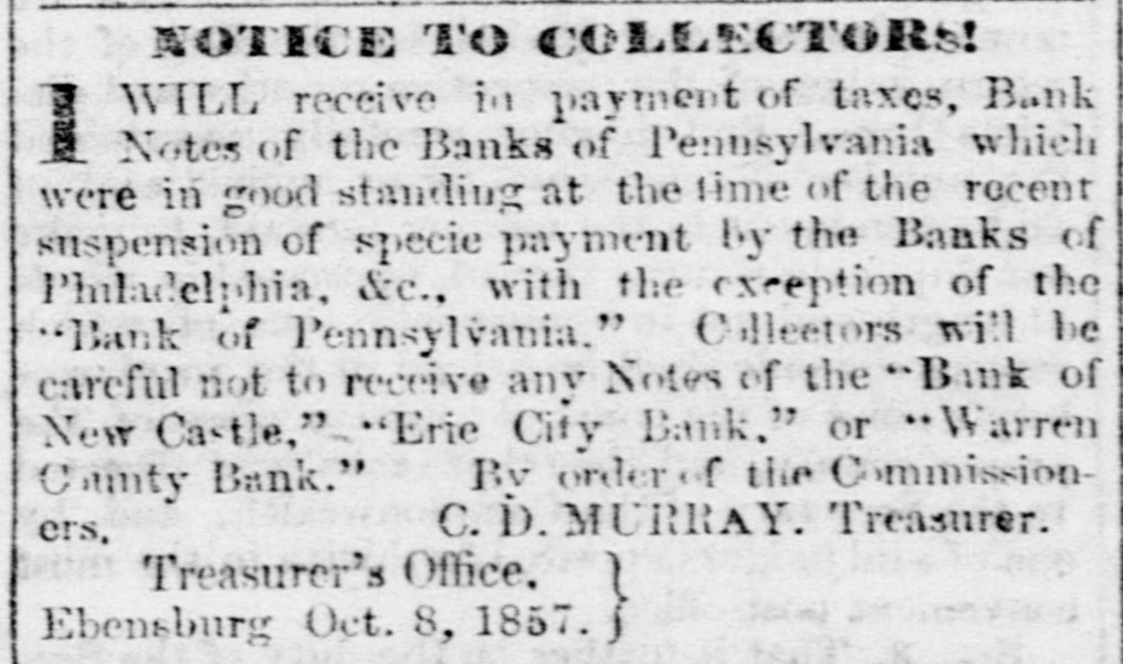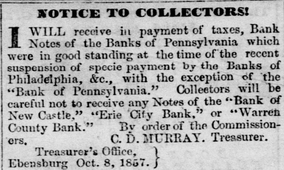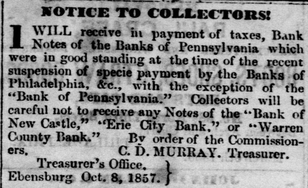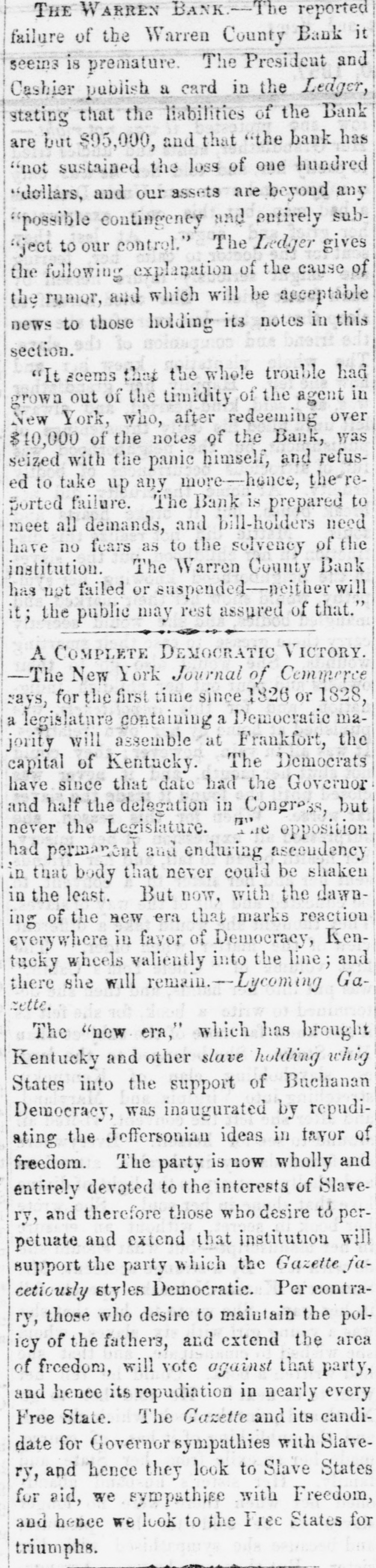 THE WARREN BANK. The reported failure of the Warren County Bank it seems is premature. The President and Cashier publish a card in the Ledger, stating that the liabilities of the Bank are but $95,000, and that "the bank has "not sustained the loss of one hundred dollars, and our assets are beyond any "possible contingency and entirely subject to our control." The Ledger gives the following explanation of the cause of the rumor, and which will be acceptable news to those holding its notes in this section. "It seems that the whole trouble had grown out of the timidity of the agent in New York, who, after redeeming over $10,000 of the notes of the Bank, was seized with the panic himself, and refused to take up any more-hence, the reported failure. The Bank is prepared to meet all demands, and bill-holders need have no fears as to the solvency of the institution. The Warren County Bank has not failed or suspended-neither will it; the public may rest assured of that." # A COMPLETE DEMOCRATIC VICTORY. -The New York Journal of Commerce says, for the first time since 1826 or 1828, a legislature containing a Democratic majority will assemble at Frankfort, the capital of Kentucky. The Democrats have since that date had the Governor and half the delegation in Congress, but never the Legislature. The opposition had permanent and enduring ascendency in that body that never could be shaken in the least. But now, with the dawning of the new era that marks reaction everywhere in favor of Democracy, Kentucky wheels valiently into the line; and there she will remain. --Lycoming Gazette. The "new era," which has brought Kentucky and other slave holding whig States into the support of Buchanan Democracy, was inaugurated by repudiating the Jeffersonian ideas in favor of freedom. The party is now wholly and entirely devoted to the interests of Slavery, and therefore those who desire to perpetuate and extend that institution will support the party which the Gazette facetiously styles Democratic. Per contrary, those who desire to maintain the policy of the fathers, and extend the area of freedom, will vote against that party, and hence its repudiation in nearly every Free State. The Gazette and its candidate for Governor sympathies with Slavery, and hence they look to Slave States for aid, we sympathise with Freedom, and hence we look to the Free States for triumphs.