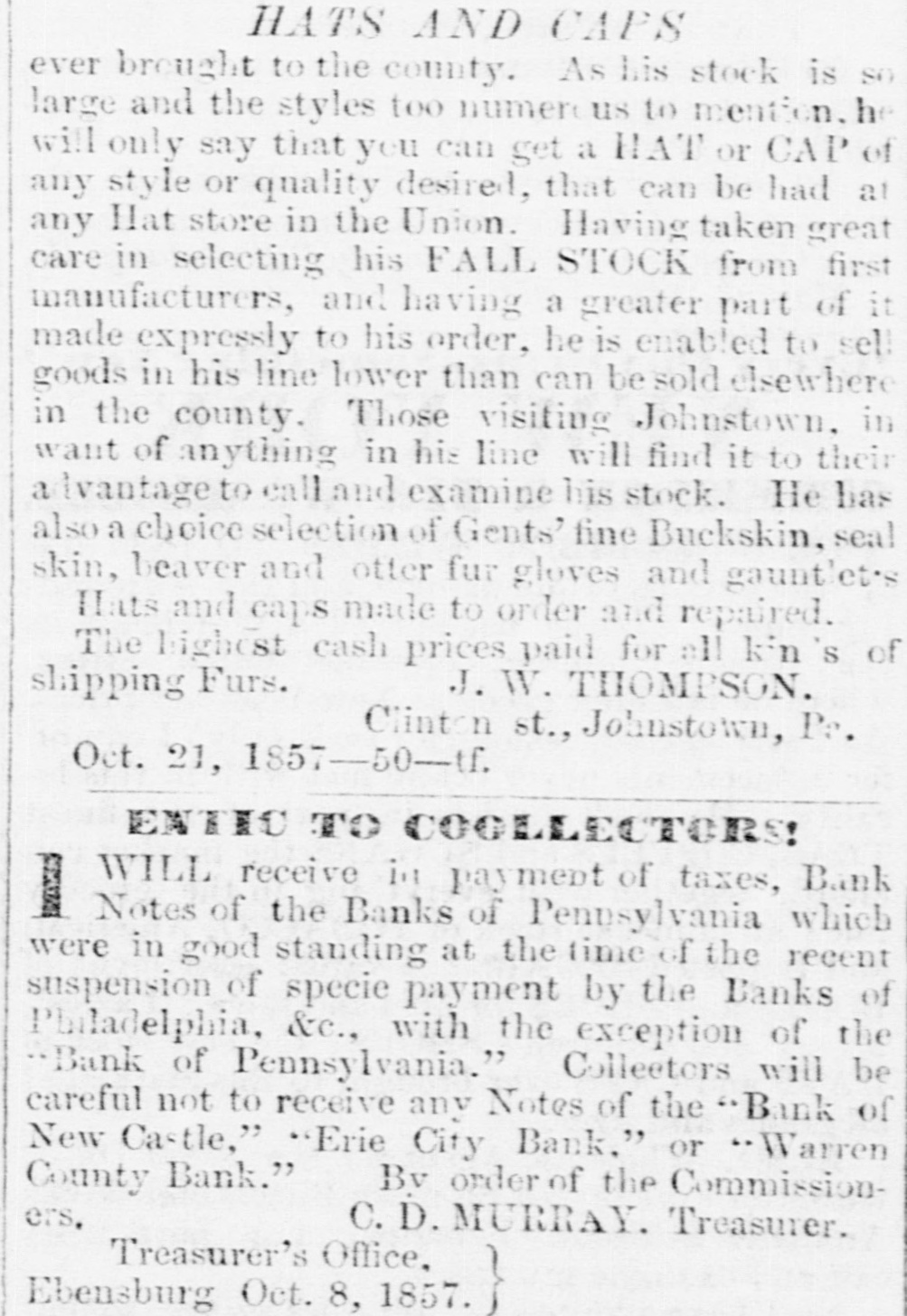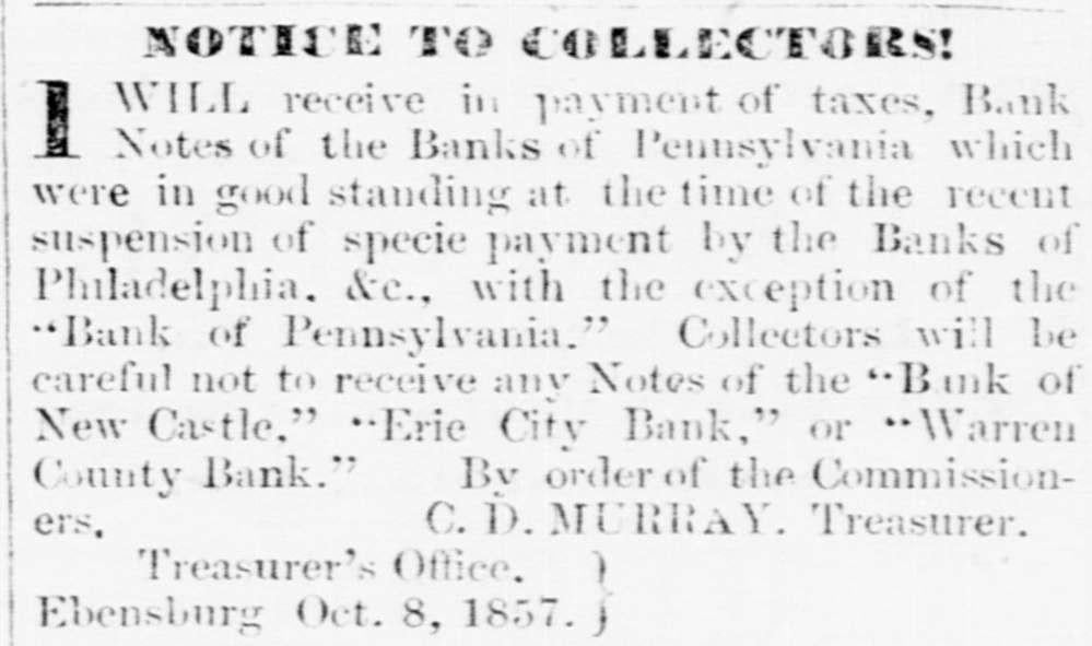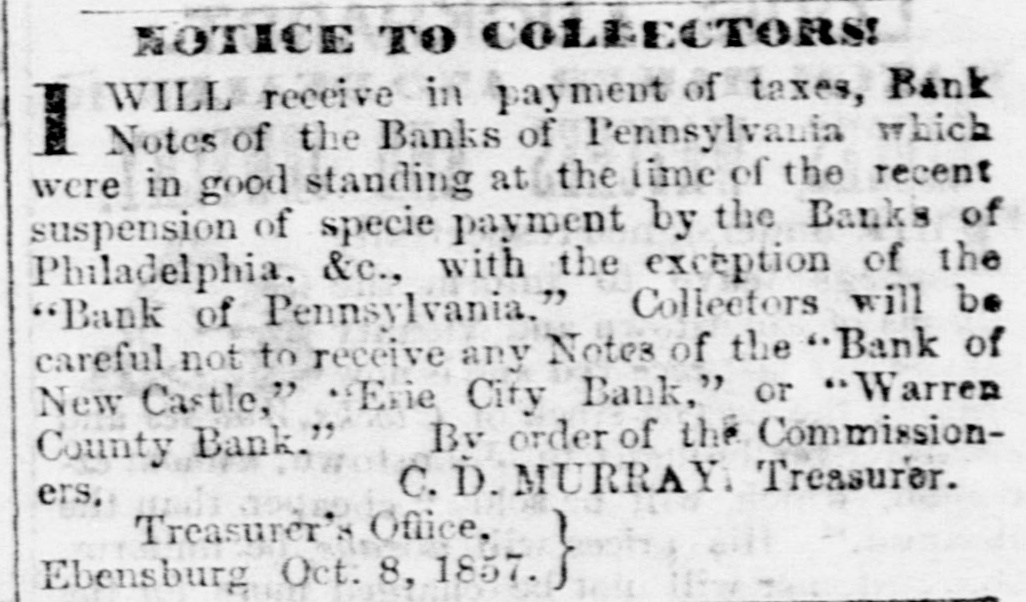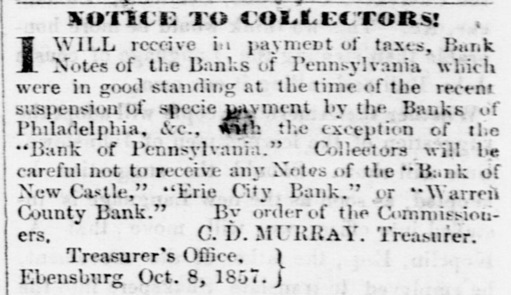 THE WARREN BANK. The reported failure of the Warren County Bank it seems is premature. The President and Cashier publish a card in the Ledger, stating that the liabilities of the Bank are but $95,000, and that "the bank has "not sustained the loss of one hundred dollars, and our assets are beyond any "possible contingency and entirely subject to our control." The Ledger gives the following explanation of the cause of the rumor, and which will be acceptable news to those holding its notes in this section. "It seems that the whole trouble had grown out of the timidity of the agent in New York, who, after redeeming over $10,000 of the notes of the Bank, was seized with the panic himself, and refused to take up any more-hence, the reported failure. The Bank is prepared to meet all demands, and bill-holders need have no fears as to the solvency of the institution. The Warren County Bank has not failed or suspended-neither will it; the public may rest assured of that." # A COMPLETE DEMOCRATIC VICTORY. -The New York Journal of Commerce says, for the first time since 1826 or 1828, a legislature containing a Democratic majority will assemble at Frankfort, the capital of Kentucky. The Democrats have since that date had the Governor and half the delegation in Congress, but never the Legislature. The opposition had permanent and enduring ascendency in that body that never could be shaken in the least. But now, with the dawning of the new era that marks reaction everywhere in favor of Democracy, Kentucky wheels valiently into the line; and there she will remain. --Lycoming Gazette. The "new era," which has brought Kentucky and other slave holding whig States into the support of Buchanan Democracy, was inaugurated by repudiating the Jeffersonian ideas in favor of freedom. The party is now wholly and entirely devoted to the interests of Slavery, and therefore those who desire to perpetuate and extend that institution will support the party which the Gazette facetiously styles Democratic. Per contrary, those who desire to maintain the policy of the fathers, and extend the area of freedom, will vote against that party, and hence its repudiation in nearly every Free State. The Gazette and its candidate for Governor sympathies with Slavery, and hence they look to Slave States for aid, we sympathise with Freedom, and hence we look to the Free States for triumphs.