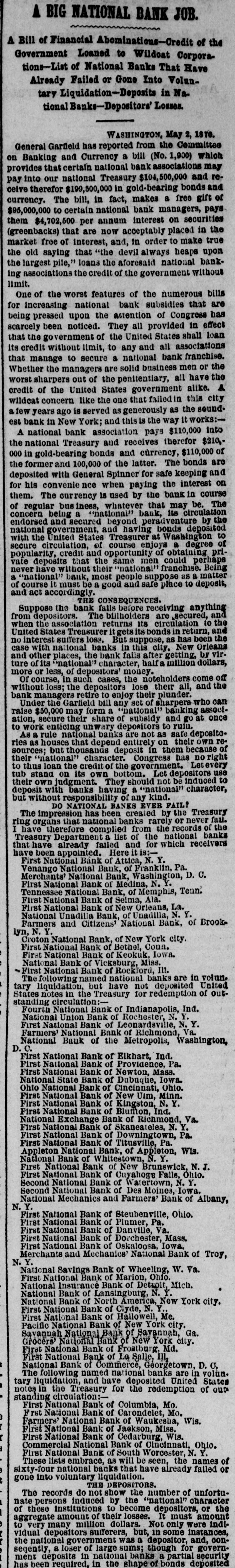 BIG NATIONAL BANK JOB. A Bill of Financial Abominations-Oredit of the Government Loaned to Wildoat Corporations-List of National Banks That Have Already Failed or Gone Into Voluntary Liquidation-Deposits in Na tional Banks-Depositors Lossos. WASHINGTON, May 2, 1810. General Garfield has reported from the Committee which Banking and Currency a bill (No. 1,900) on that certain national bank associations may provides into our national Treasury $104,500,000 bonds and and repay therefor $199,500,000 in gold-bearing of celve currency. The bill, in fact, makes a free gift pays $95,000,000 to certain national bank managers, securities them $4,702,500 per annum interest on in the (greenbacks) that are now acceptably placed true market free or interest, and, in order to make upon the old saying that "the devil always heaps banklargest pile,' loans the aforesaid national without ing the associations the credit of the government limit. of the worst features of the numerous that bills are One increasing national bank subsidies has for pressed upon the attention of Congress in effect being been noticed. They all provided shall loan scarcely the government of the United States associations that credit without limit, to any and all bank franchise. its manage to secure a national men or the that the managers are solid business all have the Whether sharpers out of the penitentiary, alike. A worst of the United States government in this city credit concern like the one that failed the soundwildcat ago is served as generously as it works:few and this is the into bank in association pays A Treasury and receives $110,000 est national national years New bank York; currency, way therefor $110,000 $210, are of the in gold-bearing bonds and The bonds General Spinner 000 the former and 100,000 of the latter. for safe keeping and on deposited his convenie with nce when paying the bank interest in course for The currency is used by the may be. The them. bus iness, whatever bank, that its circulation of concern regular being secured a national beyond pera bonds venture deposite by national endorsed government and and Treasurer having at Washington degree of to with the United States of course enjoys obtaining, a primen secure circulation, credit and opportunity of could perhaps popularity, vate deposite that their the same "national" franchise. matter Being of be must course good never "national have bank, ithout most people and safe suppose place to deposit, and act accordingly. THE CONSEQUENCES. receiving anything Suppose sitors. the bank The falls billholders before its circulation are secured, to and the from when depo the association Treasurer returns it gets its bonds as in has return, been and the United no interes State suffers loss. banks But in suppose, this city. New Orleans by vircase and other with places, national the bank character, falls halfa after getting, million dollars, more ture of or its less, national in of such depositors' cases, mone the lose noteholders their all, come and the off nagera without or course, loss; the retire depositors to enjoy their of sharpers plunder. who can may subsidy bank Under ma the Garfield form bill a any national get banking and go at associ- once ation, raise $50,000 secure their unwary share of depos positors to safe ruin. deposito. sources; to work rule enticing national banks entirel are not as on their because own of character. ries As as houses but thousands that depend deposit Congress in them has Leteve no right government. their thus loan tional' the credit of bottom. the Let depositors be induced to be tub to stand Judgment. on its own They should "national" not character, their own banks having kind. deposit with responsibility any but without NATIONAL BA NKS EVER by FAIL! the Treasury that from The impre DO reasion national has been banks created rarely the records or never the banks ring have organs Department refore complied list and of the for which national receivers that Treasury have already failed Hereit C. have First been Nat tional appointed. National Bank Bank, of Attica, of Washington, Franklin. N.Y. Pa D. Merchants' Venango National Bank of Bank, Medin of Memphis, N.Y. Tenn. Tennessee First National National Bank, of Ala. La. National and Farmers Citizens' First First National National Unadilla Bank Bank Bank, of New National of Unadilla, Orleans, Bank, N. of BrookYork city. lyn,N.Y Croton National Bank, of Bethol, of New Conn. Iowa. First National Bank of Keokuk First National Bank sburg, Miss. National in volung Nati nal Bank Bank of of national Rockford banks III. are United tary The First liquidation following in the named but Treasury have not for redemption deposited Ind. of outstanding States notes National irculation:- Bank of Rochester, Indianapolis, N.Y. Fourth Union Bank of of Leonardsville, Va. Ind First National Farmers' National National Bank Bank of Bank the Metropolis, of Richmond Washington, D. National National Bank of of Providence, Elkhart, Pa. First First National Bank Bank of Newton, Dubuque, Mass. Iowa. National First National State Bank Bank of of cincinnati, New Uim, Minn. Ohio First Ohio National National National Bank Bank of of Blunton, Kingston, Ind. . N.Y. Va. Richmond, First First National Exchange Bank Bank Skaneateles.ru of N.Y. Pa. First National National Bank Bank of of Titusville, Downingtow Pa. Wis. First National National Bank Bank, of of Appleton, First Appleton Bank National of New Brunswick Ohio. N. J. National Bank of Chyyahogt Falls N.Y. First National National Bank of of Watertown, Iowa. Second First National National Bank Bank and of Farmers Des Moine3, Bank of Albany, N First National Second National Mechanics Steubenville, Ohio. Bank of of Plumer, Pa. First National National Bank Bank of Dorchester, Danville, Iowa. Mass. First First National National Bank Bank Mechanics of Oskaloosa, National Bank of Troy, First Merchants and of Wheeling, W. Va. N National Savings Bank Bank of Marion, of Detroi