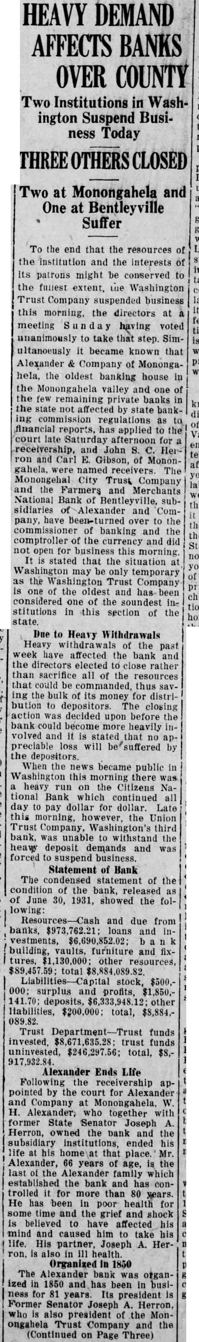HEAVY DEMAND AFFECTS BANKS OVER COUNTY Two Institutions in Washington Suspend Business Today Two at Monongahela and One at Suffer the end that the resources the institution and the of interests its patrons might be conserved to the fullest the Washington Trust Company suspended business this morning, the directors at meeting having voted unanimously to take that step. Simultanoeusly became known that Alexander Company of Monongahela, the oldest banking house the Monongahela valley and one the few remaining private banks the state affected by state commission regulations financial reports, applied the court Saturday afternoon receivership, John and Carl Gibson, gahela, named receivers. Monongehal Trust Company Farmers Merchants National Bank Bentleyville, subsidiaries Alexander and pany, have the commissioner of banking and the comptroller the currency did open for business this morning not stated that the situation be only temporary the Washington Trust Company the oldest and considered one of the soundest institutions in this section of the state Due to Heavy Withdrawals Heavy of the past have affected the bank and the elected close rather than all of the resources that be ing the bulk its for distrimoney bution depositors. The closing action decided upon before the volved and is that loss will the When the news became public this morning there heavy run the Citizens tional Bank which continued day pay dollar for dollar. Late morning, however, the Union Trust Company, third bank, unable to withstand the heavy deposit demands and was forced suspend business. Statement of Bank The condensed statement of the condition the bank, released of June 1931, showed the following: and due from banks, and investments, $6,690,852.02; building, vaults, furniture and tures, other resources, stock, surplus and profits, deposits, other liabilities, $200,000; total, Trust funds invested, trust funds uninvested, $246,297.56; total, $8,Alexander Ends Life Following pointed by the court for Alexander and Company at Monongahela, H. Alexander, together former State Senator Joseph Herron, owned the bank and the subsidiary ended his his that place. Alexander, 66 years of the last the family the bank controlled for more than 80 years He been poor health for time and the grief and shock have mind caused him take life. His partner, Joseph ron, also Organized in 1850 The Alexander organized 1850 and has been ness for years. Its Former Senator Joseph Herron, also of the MonTrust and the (Continued on Page Three)