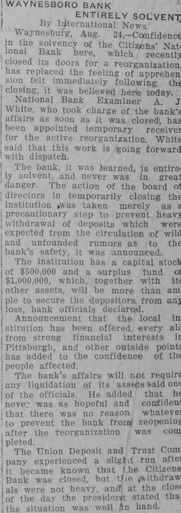 WAYNESBORO BANK ENTIRELY SOLVENT By International Waynesburg, Aug 24,-Confidence in the solvency of the Citizens' National Bank here, which recently closed its doors for a reorganization, has replaced the feeling of apprehension felt following the closing, it was believed here today. National Bank Examiner White, who took charge of the bank's affairs soon as it was closed, has been appointed temporary receiver for the active reorganization. White said that this work is going forward with dispatch. The bank, it was learned, is entiresolvent, and never was in great danger. The action of the board of directors in temporarily closing the institution taken merely as precautionary step to prevent heavy withdrawal of deposits which were expected from the circulation of wild and unfounded rumors as to the bank's safety, it was announced. The institution has capital stock $500,000 and surplus fund of which, together with its other assets, will be more than ample to secure the depositors, from any bank officials declared that the local institution has been every aid from strong financial interests in and other outside points has added the confidence of the people The bank's affairs will not require any liquidation of its assets said one of the officials. He added that he never was as hopeful and confident that there was no reason whatever to prevent the bank from reopening after the reorganization was completed. The Union Deposit and Trust Company experienced slight run after became known that Lhe Citizens' Bank was closed, but the withdrawals were not heavy, and at the close of the day the president stated that the situation was well in hand.