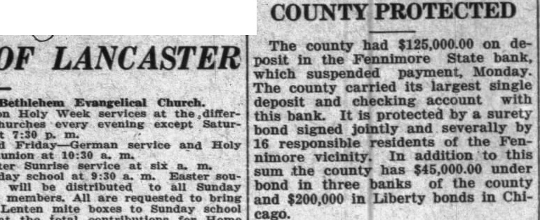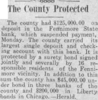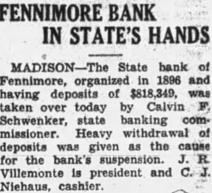 FENNIMORE SUSPENDED sign on the door the State bank here Monday, April that the place in the hands of the state banking commissioner. bank had nearly million dollars according its statement published last week. There are two banks in Fennimore, the State and the First National. Mr. and Mrs. Earl Smith of La Crosse spent with his father, William Smith. Wm. Rubin, MacArthur McKichan and Charles Roethe, students, were home for spring vacation. Mr. and Mrs. Sam Magee were in Friday, where he consulted Madison, in regard to an operation he will undergo in the near future. John Lund and family of Dalton, have the Dr. Marsden farm, former Louis McKee place, down Roger Mrs. Chris. Meyer died at her home near Woodman, Wednesday She is survived by husband and five sons. Burial made at Hope. Wilford Novinska, of John Mueller vinska, employed Plumbing Works at Madison; was for hernia the past week. erated Progressive republicans met here endorsed E. Tuffley Saturday Phi. Follette for for Reiss for governor torney general. Peacock family have Carson moved from Evansville, Wis,, to New where he is manager for Ulm, Minn., similar position but with Cudahy, good advancement. dealers of Southwestern Wisconsin had meeting and banquet the Fenway hotel Wednesday president of the McKichan, vice organization, sponsored event. The West Club were entertained dinner at the home Maso, Among Mrs. Frank M. Schleck those was of former resident here. Mrs. Chas. Horton was called the serious illness Enid, Okla., by Avis, Mrs. Byron Wynn, her daughter, taken ill while visthe latter being sister, Mabel, at iting Steinhofer of Lewiston, Mont., Dick visited Marshall, here Dick is the hardthe past and plumbing business once sheriff of the county where he resides. John Hill of Tomah, died at hosin where he pital few weeks before. treatment had visited his sisHill, Adam few Mrs. before to hospital. weeks going has remodeled his house building. first floor of opera will be used by the The entire Sales company. Jos. Auto his pool fixtures Kilby has building which the placed in good shape. Mrs. Elida son, Har- and Hinn of this city Hinn Texas, of John Hill tended funeral Tomah, Friday. daughter and sisHazel Ellis, of Madison, uptheir home. Mrs. Silas Funeral for held afterchurch with burial noon the B. beside her huswas the band. aged widow of Silas for many here. Mrs. Mrs. by only of III., with Gus whom she made her home.