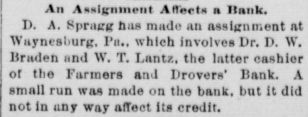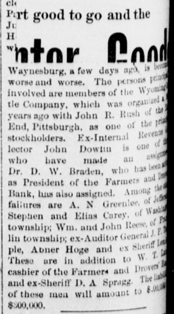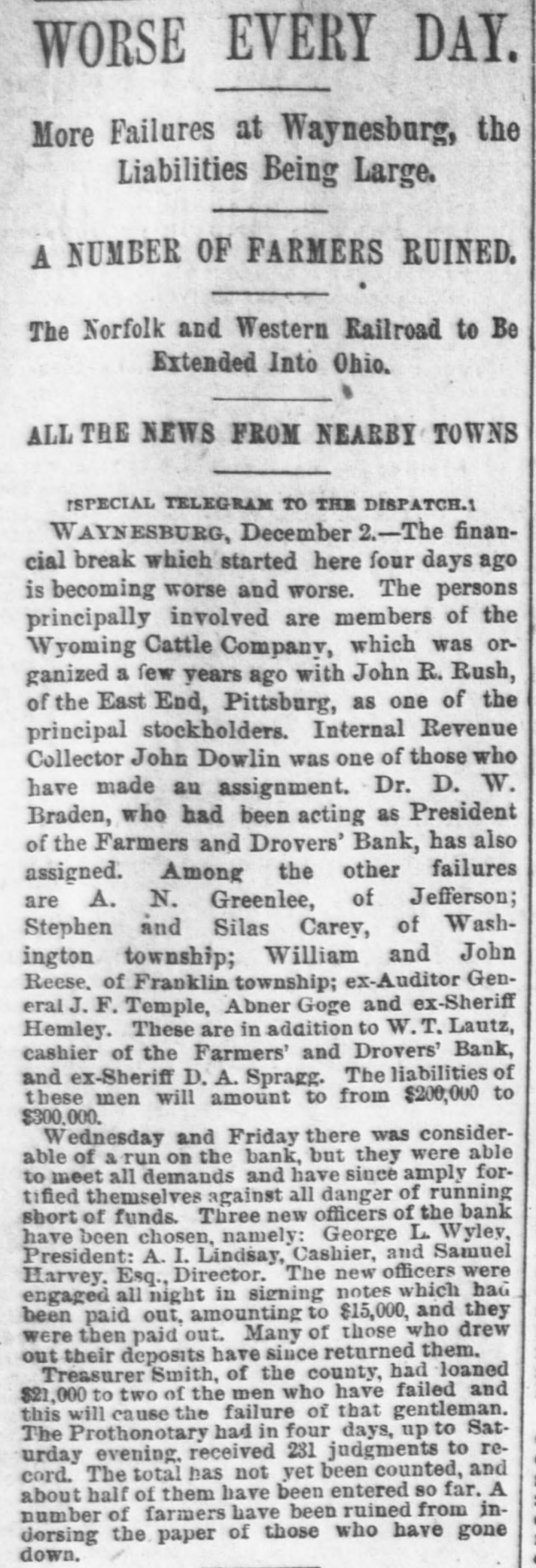 WORSE EVERY DAY. More Failures at Waynesburg, the Liabilities Being Large. A NUMBER OF FARMERS RUINED. The Norfolk and Western Railroad to Be Extended Into Ohio. ALL THE NEWS FROM NEARBY TOWNS ISPECIAL TELEGRAM TO THE DISPATCH.1 WAYNESBURG, December 2.-The financial break which started here four days ago is becoming worse and worse. The persons principally involved are members of the Wyoming Cattle Company, which was organized a few years ago with John R. Rush, of the East End, Pittsburg, as one of the principal stockholders. Internal Revenue Collector John Dowlin was one of those who have made an assignment. Dr. D. W. Braden, who had been acting as President of the Farmers and Drovers' Bank, has also assigned. Among the other failures are A. N. Greenlee, of Jefferson; Stephen and Silas Carey, of Washington township; William and John Reese. of Franklin township; ex-Auditor General J.F. Temple, Abner Goge and ex-Sheriff Hemley. These are in addition to W. T. Lautz, cashier of the Farmers' and Drovers' Bank, and ex-Sheriff D. A. Spragg. The liabilities of these men will amount to from $200,000 to $300,000. Wednesday and Friday there was considerable of a run on the bank, but they were able to meet all demands and have since amply fortified themselves against all danger of running short of funds. Three new officers of the bank have been chosen, namely: George L. Wyley, President: A. I. Lindsay, Cashier, and Samuel Harvey. Esq., Director. The new officers were engaged all night in signing notes which had been paid out, amounting to $15,000, and they were then paid out. Many of those who drew out their deposits have since returned them. Treasurer Smith, of the county, had loaned $21,000 to two of the men who have failed and this will cause the failure of that gentleman. The Prothonotary had in four days, up to Saturday evening. received 231 judgments to record. The total has not yet been counted, and about half of them have been entered SO far. A number of farmers have been ruined from indorsing the paper of those who have gone down.
