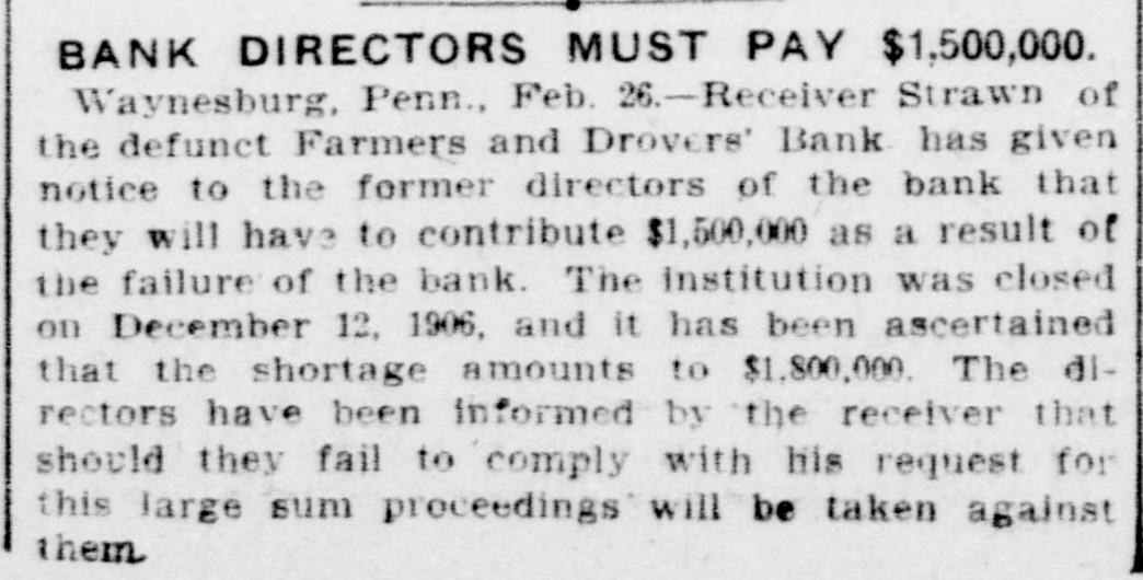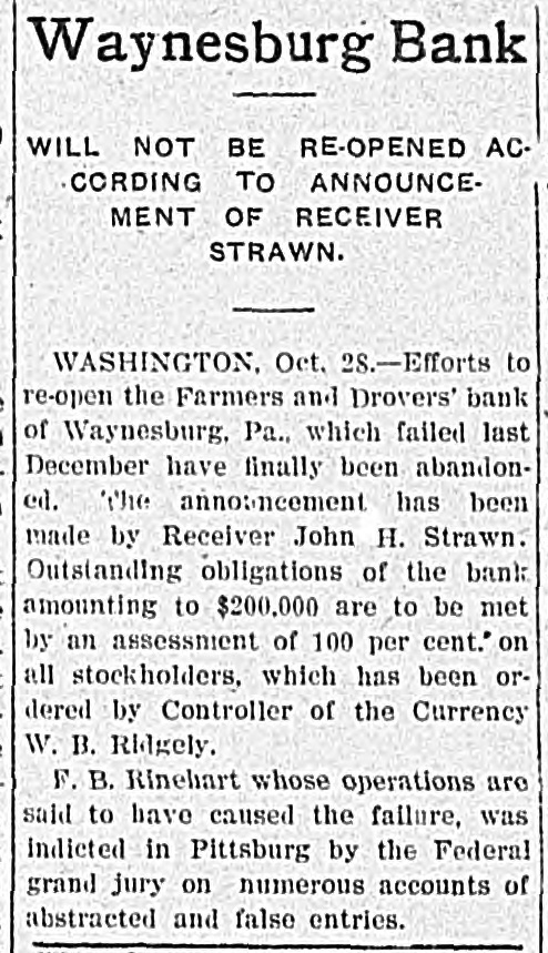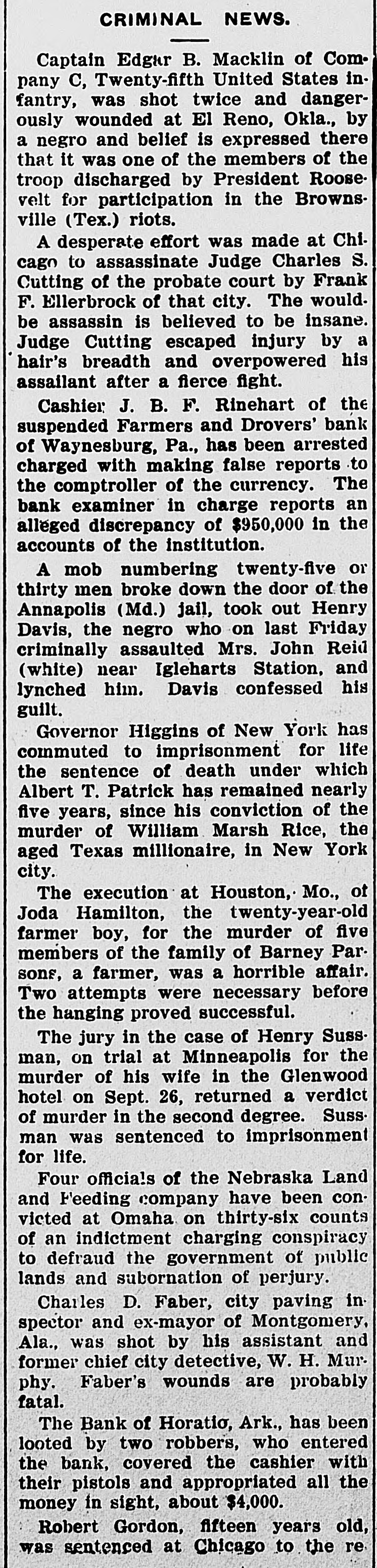 CRIMINAL NEWS. Captain Edgar B. Macklin of Company C, Twenty-fifth United States infantry, was shot twice and dangerously wounded at El Reno, Okla., by a negro and belief is expressed there that it was one of the members of the troop discharged by President Roosevelt for participation in the Brownsville (Tex.) riots. A desperate effort was made at Chicago to assassinate Judge Charles S. Cutting of the probate court by Frank F. Ellerbrock of that city. The would. be assassin is believed to be insane. Judge Cutting escaped injury by a hair's breadth and overpowered his assailant after a fierce fight. Cashier J. B. F. Rinehart of the suspended Farmers and Drovers' bank of Waynesburg, Pa., has been arrested charged with making false reports to the comptroller of the currency. The bank examiner in charge reports an alleged discrepancy of $950,000 in the accounts of the institution. A mob numbering twenty-five or thirty men broke down the door of the Annapolis (Md.) jail, took out Henry Davis, the negro who on last Friday criminally assaulted Mrs. John Reid (white) near Igleharts Station, and lynched him. Davis confessed his guilt. Governor Higgins of New York has commuted to imprisonment for life the sentence of death under which Albert T. Patrick has remained nearly five years, since his conviction of the murder of William Marsh Rice, the aged Texas millionaire, in New York city. The execution at Houston, Mo., of Joda Hamilton, the twenty-year-old farmer boy, for the murder of five members of the family of Barney Parsons, a farmer, was a horrible affair. Two attempts were necessary before the hanging proved successful. The jury in the case of Henry Suss. man, on trial at Minneapolis for the murder of his wife in the Glenwood hotel on Sept. 26, returned a verdict of murder in the second degree. Sussman was sentenced to imprisonment for life. Four officials of the Nebraska Land and Feeding company have been convicted at Omaha on thirty-six counts of an indictment charging conspiracy to defraud the government of public lands and subornation of perjury. Charles D. Faber, city paving in spector and ex-mayor of Montgomery, Ala., was shot by his assistant and former chief city detective, W. H. Murphy. Faber's wounds are probably fatal. The Bank of Horatio, Ark., has been looted by two robbers, who entered the bank, covered the cashier with their pistols and appropriated all the money in sight, about $4,000. Robert Gordon, fifteen years old, was sentenced at Chicago to the re.