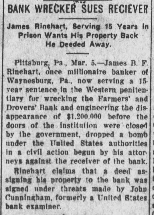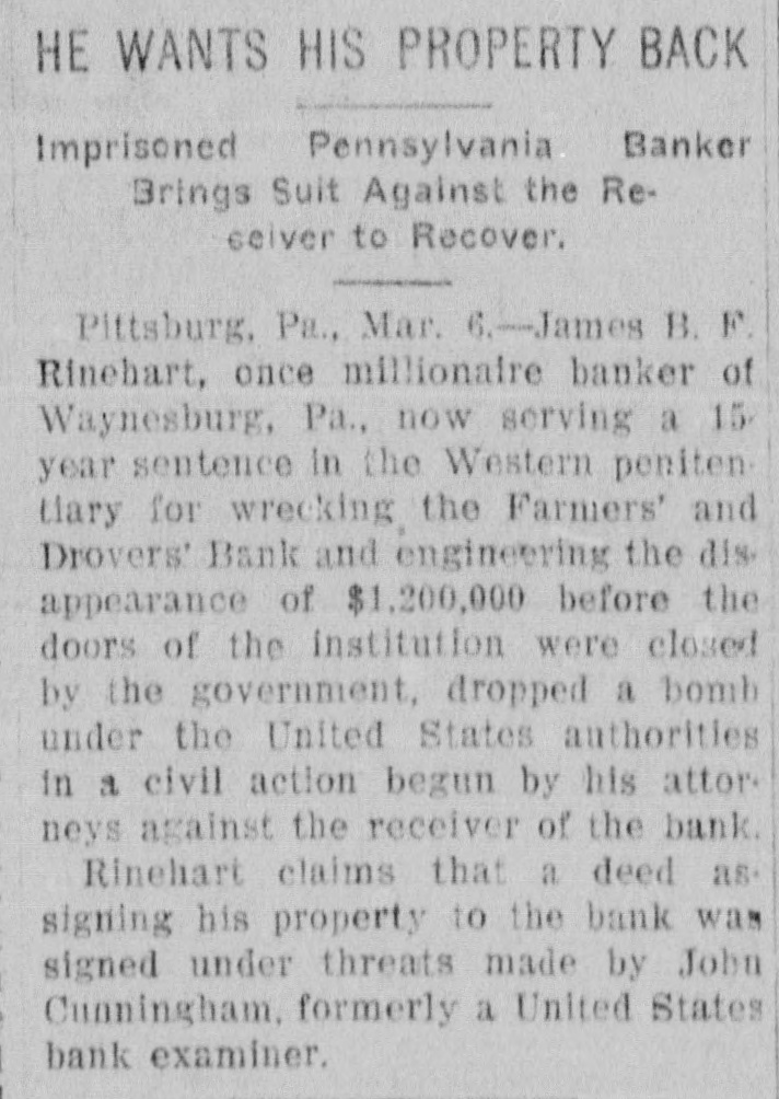 # HE WANTS HIS PROPERTY BACK Imprisoned Pennsylvania Banker Brings Suit Against the Receiver to Recover. Pittsburg, Pa., Mar. 6.-James B. F. Rinehart, once millionaire banker of Waynesburg, Pa., now serving a 15-year sentence in the Western penitentiary for wrecking the Farmers' and Drovers' Bank and engineering the disappearance of $1,200,000 before the doors of the institution were closed by the government, dropped a bomb under the United States authorities in a civil action begun by his attorneys against the receiver of the bank. Rinehart claims that a deed assigning his property to the bank was signed under threats made by John Cunningham, formerly a United States bank examiner.
