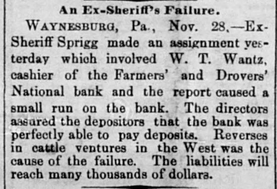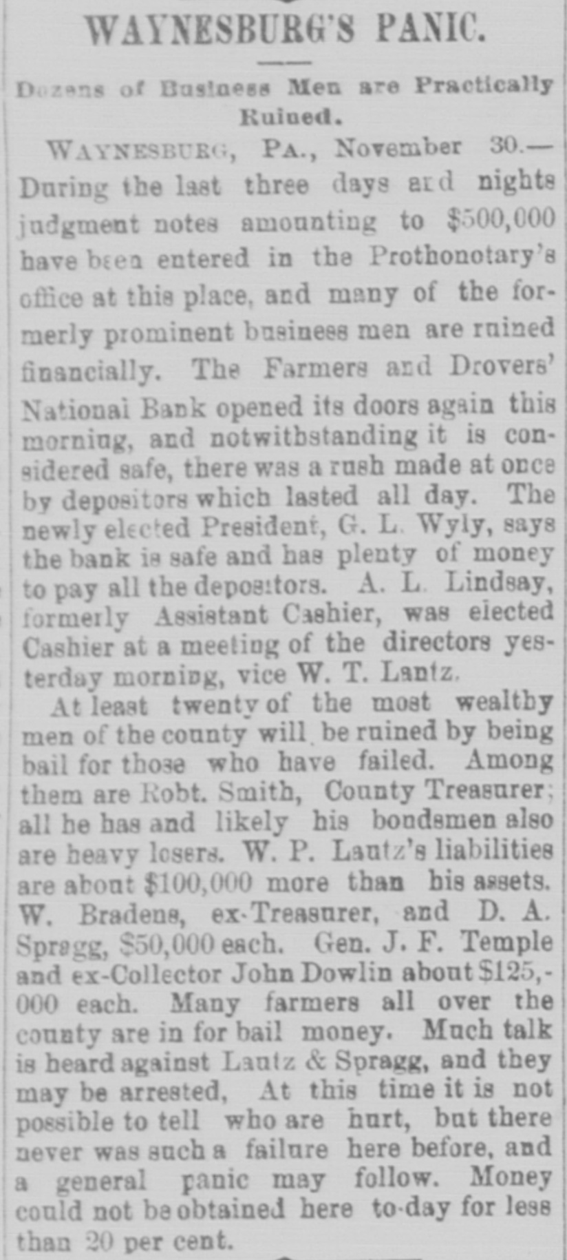 WAYNESBURG'S PANIC. Dozens of Business Men are Practically Ruined. WAYNESBURG, PA., November 30.During the last three days and nights judgment notes amounting to $500,000 have been entered in the Prothonotary's office at this place, and many of the formerly prominent business men are rained financially. The Farmers and Drovers' National Bank opened its doors again this morning, and notwithstanding it is considered safe, there was a rush made at once by depositors which lasted all day. The newly elected President, G. L. Wyly, says the bank is safe and has plenty of money to pay all the depositors. A. L. Lindsay, formerly Assistant Cashier, was elected Cashier at a meeting of the directors yesterday morning, vice W. T. Lantz. At least twenty of the most wealthy men of the county will be ruined by being bail for those who have failed. Among them are Robt. Smith, County Treasurer; all he has and likely his bondsmen also are heavy losers. W.P. Lautz's liabilities are about $100,000 more than his assets. W. Bradens, ex-Treasurer, and D. A. Spragg, $50,000 each. Gen. J. F. Temple and ex-Collector John Dowlin about $125,000 each. Many farmers all over the county are in for bail money. Much talk is heard against Lautz & Spragg, and they may be arrested, At this time it is not possible to tell who are hurt, but there never was such a failure here before, and a general panic may follow. Money could not be obtained here to-day for less than 20 per cent.