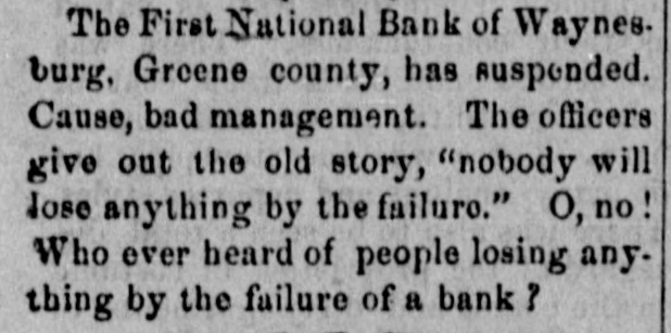 The First National Bank of Waynes. burg, Greene county, has suspended. Cause, bad management. The officers give out the old story, "nobody will lose anything by the failure." O,no! Who ever heard of people losing anything by the failure of a bank ?
