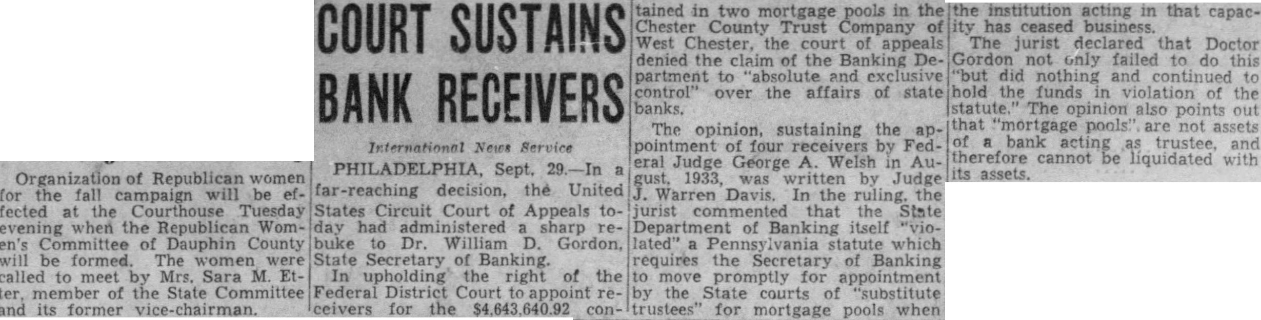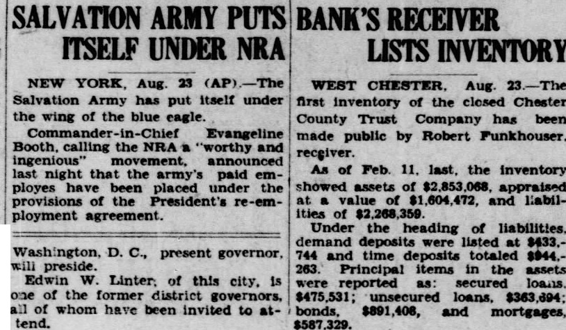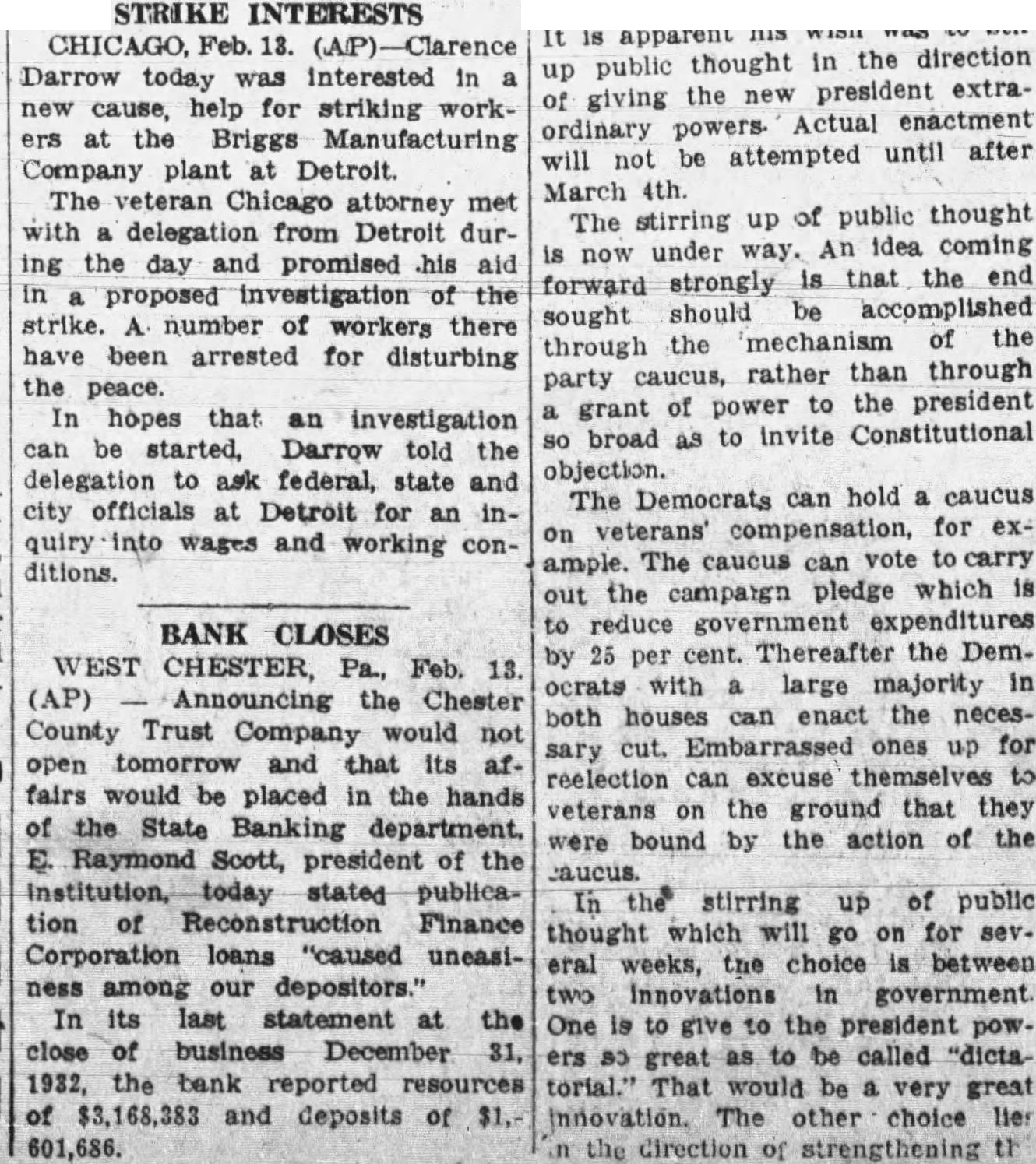STRIKE INTERESTS CHICAGO, today interested new cause, help for striking workat the Briggs Manufacturing Company plant The attorney met with delegation from Detroit ing the day and promised his aid proposed investigation strike. number workers there have been arrested for disturbing the peace. hopes that an investigation can be started, Darrow told the delegation ask federal, state and city Detroit an quiry into wages and working ditions. BANK CLOSES per cent. Thereafter the DemWEST CHESTER, Feb. 13. ocrats with large (AP) Announcing the Chester both can the necesCounty Trust Company not cut. ones up for open and reelection excuse fairs would be placed in the hands veterans the ground that they State Banking department. were bound by the action the Raymond Scott, president of the the stirring public tion of Finance thought which on for Corporation loans "caused uneasiweeks, the choice between ness among our depositors.' Innovations government. In its last statement at the One to give the president December called "dictathe bank would great very $3,168,383 and deposits choice direction strengthening