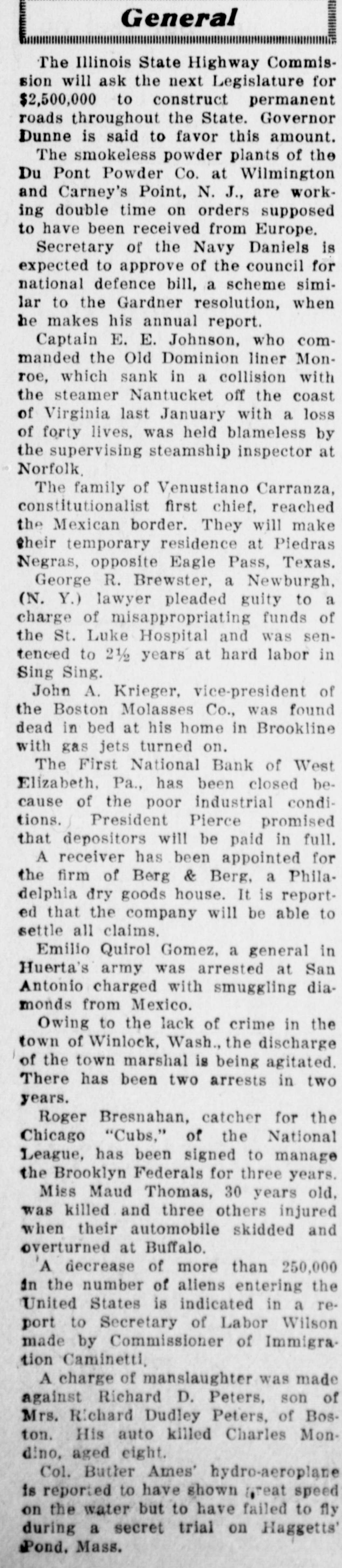 Negras, opposite Eagle Pass, Texas. George R. Brewster, a Newburgh, (N. Y.) lawyer pleaded guity to a charge of misappropriating funds of the St. Luke Hospital and was sentenced to 2 1/2 years at hard labor in Sing Sing. John A. Krieger, vice-president of the Boston Molasses Co., was found dead in bed at his home in Brookline with gas jets turned on. The First National Bank of West Elizabeth, Pa., has been closed because of the poor industrial conditions. President Pierce promised that depositors will be paid in full. A receiver has been appointed for the firm of Berg & Berg, a Phila. delphia dry goods house. It is reported that the company will be able to settle all claims. Emilio Quirol Gomez, a general in Huerta's army was arrested at San Antonio charged with smuggling diamonds from Mexico. Owing to the lack of crime in the town of Winlock, Wash., the discharge of the town marshal is being agitated. There has been two arrests in two years. Roger Bresnahan, catcher for the Chicago "Cubs," of the National League, has been signed to manage the Brooklyn Federals for three years. Miss Maud Thomas, 30 years old, was killed and three others injured when their automobile skidded and overturned at Buffalo. A decrease of more than 250,000 in the number of aliens entering the United States is indicated in a report to Secretary of Labor Wilson made by Commissioner of Immigration Caminetti, A charge of manslaughter was made against Richard D. Peters, son of Mrs. Richard Dudley Peters, of Boston. His auto killed Charles Mondino, aged eight. Col. Butler Ames' hydro-aeroplane is reported to have shown great speed on the water but to have failed to fly during a secret trial on Haggetts' Pond, Mass.