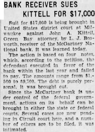 BANK SUES FOR FUND RECOVERY from John A. Kittell, Green Bay attorney, is sought Bosworth, receiver for the McCartney National bank, Green Bay, in suit filed in federal court Wednesday. Albert L. Disterbeck and Disterbeck, Two another suit filed by Bosworth in behalf of the bank. hold 10 of par value stock in the and to pay an assessment of cent.