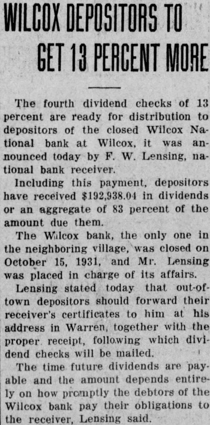 WILCOX DEPOSITORS TO GET 13 PERCENT MORE The fourth dividend checks of 13 percent are ready for distribution to depositors of the closed Wilcox National bank at Wilcox, it was announced today by F. W. Lensing, national bank receiver. Including this payment, depositors have received $192,938.04 in dividends or an aggregate of 83 percent of the amount due them. The Wilcox bank, the only one in the neighboring village, was closed on October 15, 1931, and Mr. Lensing was placed in charge of its affairs. Lensing stated today that out-oftown depositors should forward their receiver's certificates to him at his address in Warren, together with the proper receipt, following which dividend checks will be mailed. The time future dividends are pay. able and the amount depends entirely on how promptly the debtors of the Wilcox bank pay their obligations to the receiver, Lensing said.