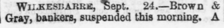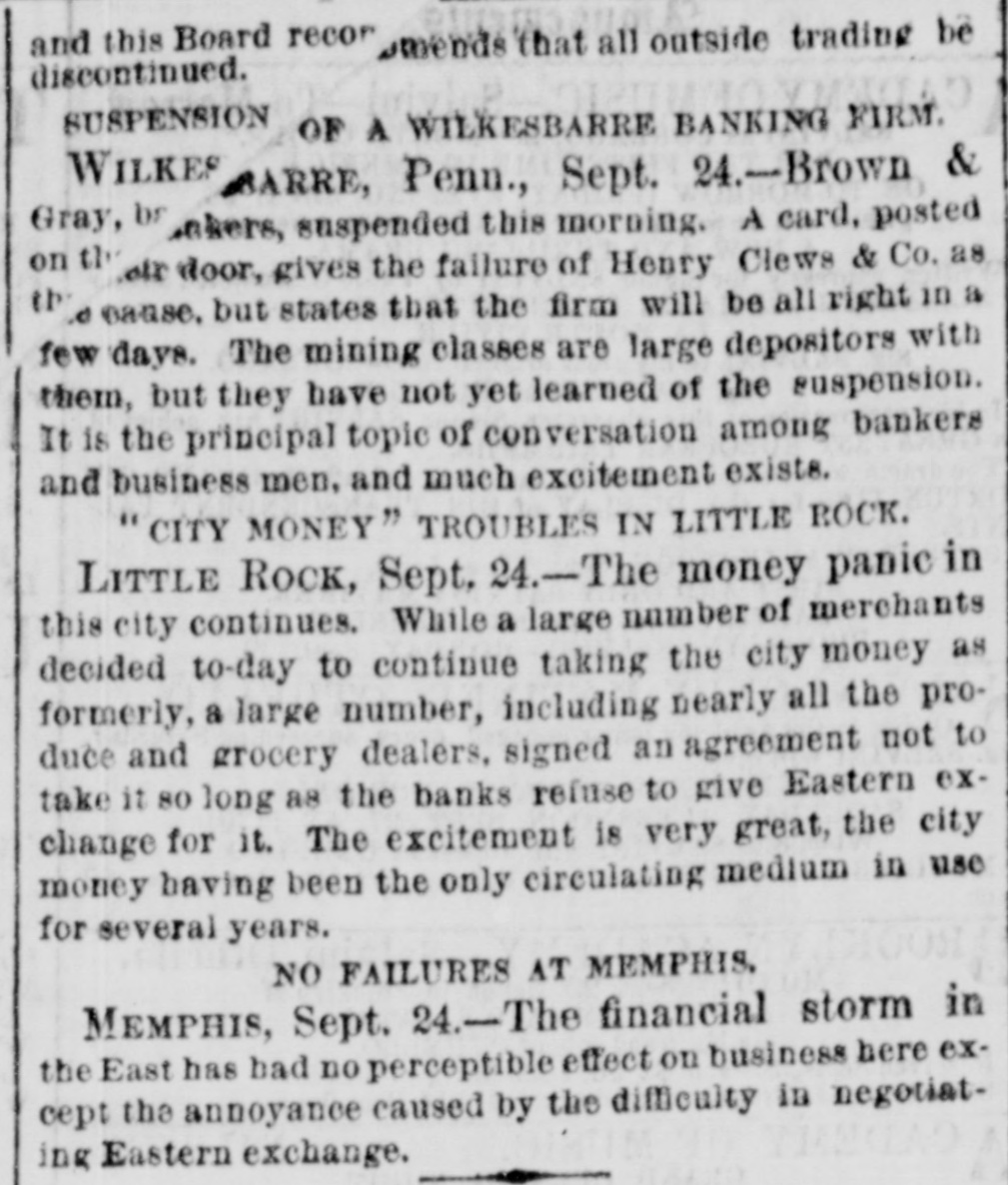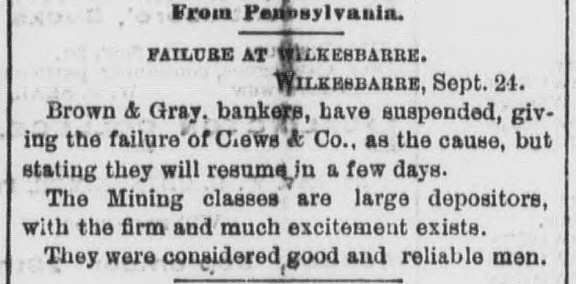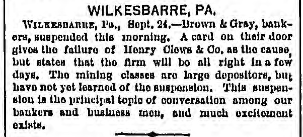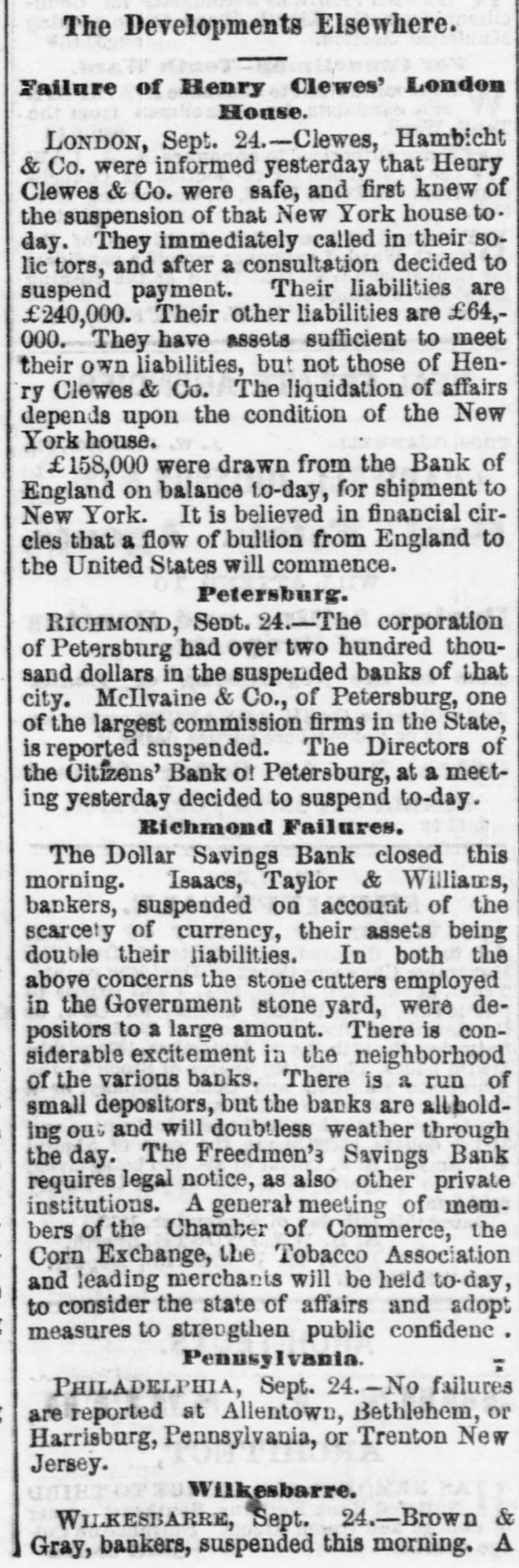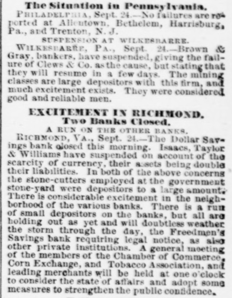The Situation in Pennsy Iyania. PHILADELPHIA, Sept. 24 No failures are rew ported at Alleutown. Bethelem, Harrisburg, Pa., and Trenton, N.J. SUSPENSION AT WILKESRARRE WILKESBABRE, PA., Sept. 24 -Brown & Gray, bankers, have suspended, giving the failure of Clews & Co. as the cause, but stating that they will resume in a few days. The mining classes are large depositors with this firm, and much excitement exists. They were considered good and reliable men. EXCITEMENT IN RICHMOND. Two Banks Closed. A RUN ON THE OTHER BANKS. RICHMOND, VA., Sept. -The Dollar Savings bank closed this morning. Isaacs, Taylor & Williams have suspended on account of the scarcity of currency, their assets being double their liabilities. In both of the above concerns the stone-cutters employed at the government stone-yard were depositors to a large amount. There is considerable excitement in the neighborhood of the various banks. There is a run of small depositors on the banks, but all are holding out as yet and will doubtless weather the storm through the day, the Freedmen's Savings bank requiring legal notice, as also other private institutions. A general meeting of the members of the Chamber of Commerce, Corn Exchange, and Tobacco Association, and leading merchants will be held at one o'clock to consider the state of affairs and adopt some measures to strengthen the public confidence.