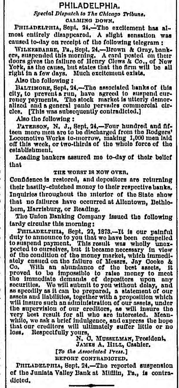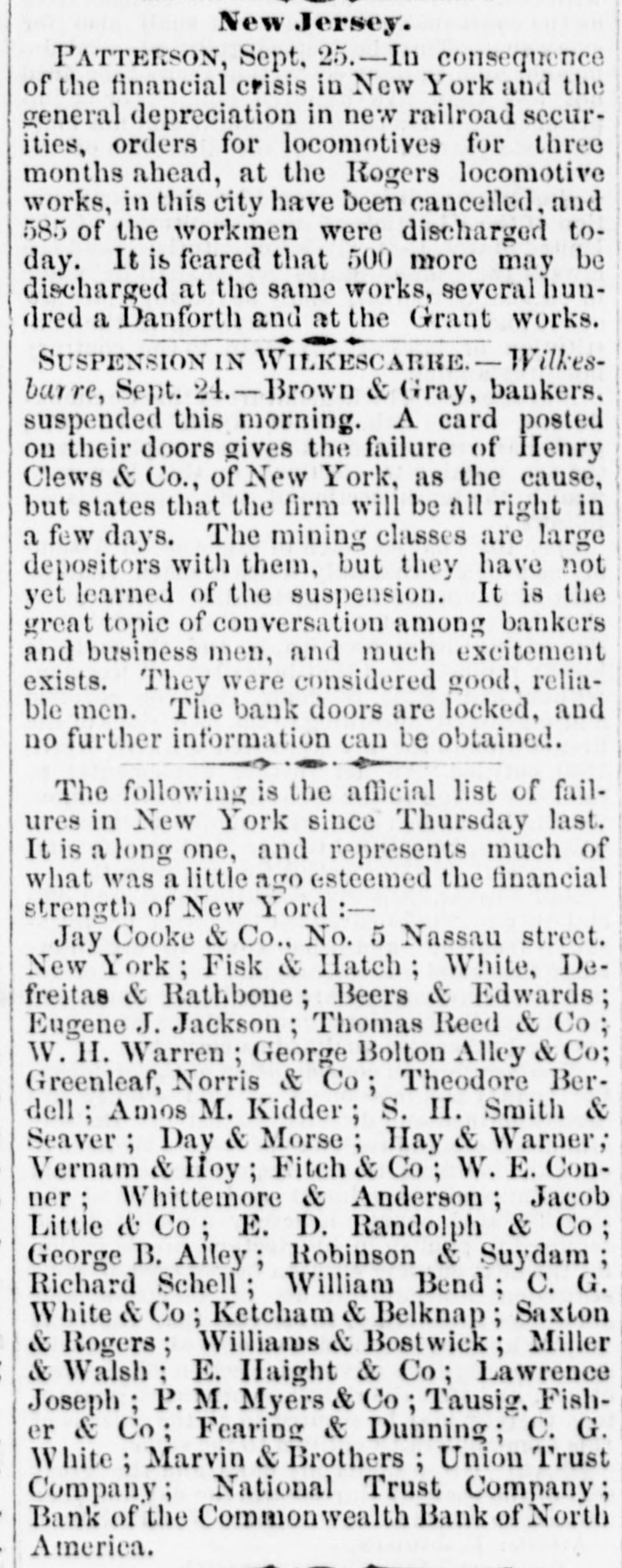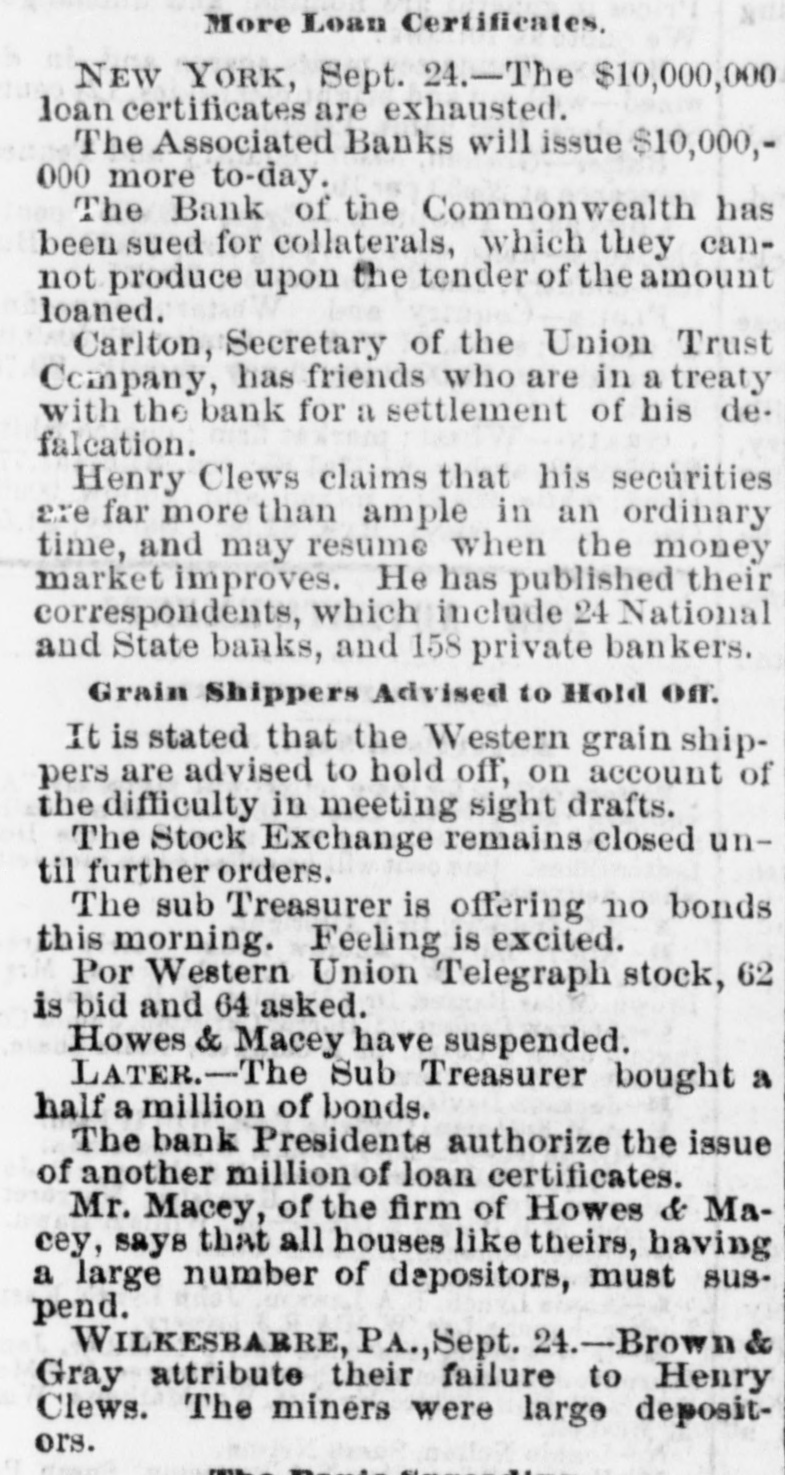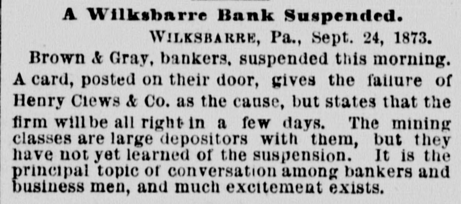The Situation in Pennsy Iyania. PHILADELPHIA, Sept. 24 No failures are rew ported at Alleutown. Bethelem, Harrisburg, Pa., and Trenton, N.J. SUSPENSION AT WILKESRARRE WILKESBABRE, PA., Sept. 24 -Brown & Gray, bankers, have suspended, giving the failure of Clews & Co. as the cause, but stating that they will resume in a few days. The mining classes are large depositors with this firm, and much excitement exists. They were considered good and reliable men. EXCITEMENT IN RICHMOND. Two Banks Closed. A RUN ON THE OTHER BANKS. RICHMOND, VA., Sept. -The Dollar Savings bank closed this morning. Isaacs, Taylor & Williams have suspended on account of the scarcity of currency, their assets being double their liabilities. In both of the above concerns the stone-cutters employed at the government stone-yard were depositors to a large amount. There is considerable excitement in the neighborhood of the various banks. There is a run of small depositors on the banks, but all are holding out as yet and will doubtless weather the storm through the day, the Freedmen's Savings bank requiring legal notice, as also other private institutions. A general meeting of the members of the Chamber of Commerce, Corn Exchange, and Tobacco Association, and leading merchants will be held at one o'clock to consider the state of affairs and adopt some measures to strengthen the public confidence.