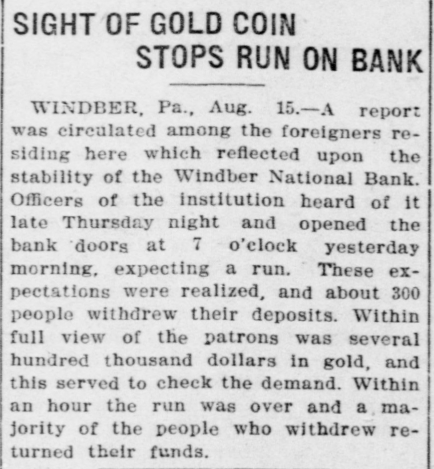 SIGHT OF GOLD COIN STOPS RUN ON BANK WINDBER, Pa., Aug. 15.-A report was circulated among the foreigners residing here which reflected upon the stability of the Windber National Bank. Officers of the institution heard of it late Thursday night and opened the bank doors at 7 o'elock yesterday morning, expecting a run. These expectations were realized, and about 300 people withdrew their deposits. Within full view of the patrons was several hundred thousand dollars in gold, and this served to check the demand. Within an hour the run was over and a majority of the people who withdrew returned their funds.