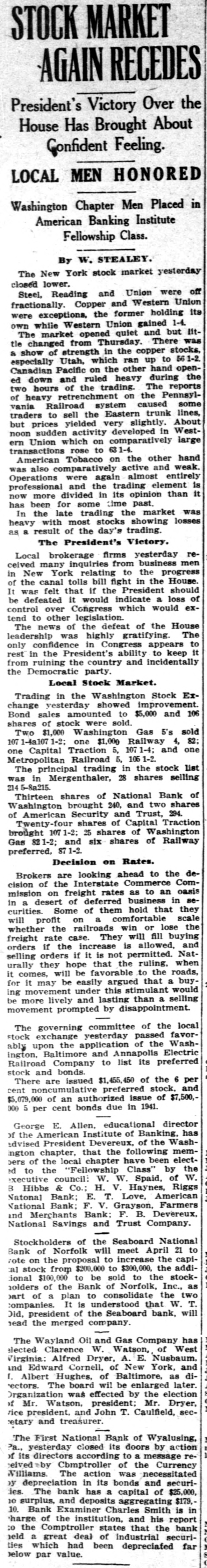 STOCK MARKET AGAIN RECEDES President's Victory Over the House Has Brought About Confident Feeling. LOCAL MEN HONORED Washington Chapter Men Placed in American Banking Institute Fellowship Class. By W. STEALEY. The New York stock market yesterday closed lower. Steel, Reading and Union were Union off fractionally. Copper and Western its exceptions, the former holding 1-4. IItown were while Western Union quiet gained and but The market opened There was of show tle changed strength from Thursday. in the copper stocks, to 561-2. a Utah, which ran up openespecially Pacific on the other hand the ed Canadian down and ruled trading. heavy The during reports two of heavy hours retrenchment of the system on caused the Pennsyl- some vania Railroad Eastern trunk lines, traders to sell the slightly. About prices yielded very in Westbut sudden activity developed large ern noon Union which on comparatively transactions American Tobacco rose to 63 1-4. on the other weak. hand was also comparatively again active almost and entirely professional Operations were and the trading element than is it now more divided in its opinion has been for some time past. the late trading the market losses was heavy In with most stocks showing as a result of the day's trading. The President's Victory. Local brokerage firms yesterday men received many inquiries from business New York relating to the progress House. in of the canal tolls bill fight President in the should felt that if the loss of It was defeated it would indicate a excontrol be over Congress which would tend to other legislation. The news of the defeat of the House The leadership was highly gratifying. to confidence in Congress appears it only in the President's ability to keep rest from ruining the country and incidentally the Democratic party. Local Stock Market. Trading in the Washington Stock Exchange vesterday showed improvement. 106 Bond sales amounted to $5,000 and of stock were sold. shares Two $1,000 Washington Gas 5's sold 82; 107 1-4a107 1-2; one $1,000 Railway and 4, one Capital Traction 5. 107 1-4; Metropolitan one Railroad 5, 105 1-2. The principal trading in the stock selling list was in Mergenthaler, 28 shares 214 5-8a.215. Thirteen shares of National Bank shares of Washington brought 240, and two 294. of American Security and Trust, Twenty-four shares of Capital Traction brought 107 1-2; 25 shares of Washington Railway Gas 82 1-2; and six shares of preferred, 87 1-2. Decision on Rates. Brokers are looking ahead to the Com- decision of the Interstate rates Commerce as to an oasis mission on freight deferred business in sein a desert Some of of them hold that scale they curities comfortable will profit on a win or lose the whether the railroads They will fill buying freight if rate the case. increase is allowed, Nat- and selling orders orders if it that is not the permitted. ruling. when urally they hope favorable to the roads, it comes, it may will be be easily argued that a would buyfor movement under this stimulant selling ing more lively and lasting than a movement be prompted by disappointment. governing committee of the favor- local stock The exchange yesterday passed Washupon the application of the Electric ably Baltimore and Annapolis ington, Railroad Company to list its preferred and bonds. stock are issued $1,455,450 of the 6 and per There noncumulative preferred stock, $7,500,cent $5,079,000 of an authorized issue of 000 5 per cent bonds due in 1941. E. Allen, educational director has George American Institute of Banking, Washadvised of the President Devereux, of the memchapter, that the following electington of the local chapter have been by the pers the "Fellowship Class" W. ed to W. W. Spaid, of B executive Hibbs council: & Co.; H. T. V. Love, Haynes, American Riggs Natonal National Bank; Bank; F. E. V. Grayson, Farmers Merchants Bank: F. B. Devereux, National and Savings and Trust Company. Stockholders of the Seaboard National 21 to of Norfolk will meet April Bank on the proposal to increase the addi- capirote stock from $200,000 to $300,000, the stocktal tional $100,000 to be sold to the holders of the Bank of Norfolk, Inc., two as part of a plan to consolidate the W. T. It is understood that Did, companies. president of the Seaboard bank, will head the merged company. The Wayland Oil and Gas Company has elected Clarence W. Watson, Nusbaum, of West Virginia: Alfred Dryer, A. E. and Edward Cornell, of New York, and Albert Hughes, of Baltimore, as diI. rectors. The board will be enlarged later. Organization was effected by the election of Mr. Watson, president; Mr. Dryer, secrice president, and John T. Caulfield, retary and treasurer. The First National Bank of Wyalusing, yesterday closed its doors by action of Pa., its directors according to a message reeived by Comptroller of the Currency Williams The action was necessitated depreciation in its bonds and securiy ies. The bank has a capital of $25,000, 10 surplus, and deposits aggregating $179, 10. Bank Examiner Charles Smith is in harge of the institution, and his report the Comptroller states that the bank :o held a great deal of industrial securities which had been depreciated far below par value.