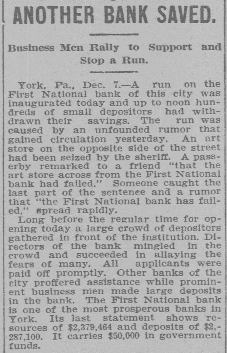 RUN ON PENNSYLVANIA BANK Excitement Caused by Misunder= stood Remark of a Passerby By Associated Press. YORK, Pa., Dec. 7.-A run on the First National bank of this city was inaugurated today and up to noon hundreds of excited depositors had withdrawn their savings. The run was caused by an unfounded rumor that gained circulation yesterday. An art store on the opposite side of the street had been seized by the sheriff. A passerby remarked to a friend that "the art store across from the First National bank had failed." Some one caught the last part of the sentence and a rumor that "the First National bank had failed" spread rapidly. Long before the regular time for opening today a large crowd of depositors gathered in front of the institution. Directors of the bank mingled in the crowd and succeeded in allaying the fears of many. All applicants were paid off promtly. Other banks of the city proffered assistance while prominent business men made large deposits in the bank. The First National is one of the most prosperous banks in York. Its last statement shows resources of $2,379,464 and deposits of $2,287,109. It carries $50,000 in government funds.