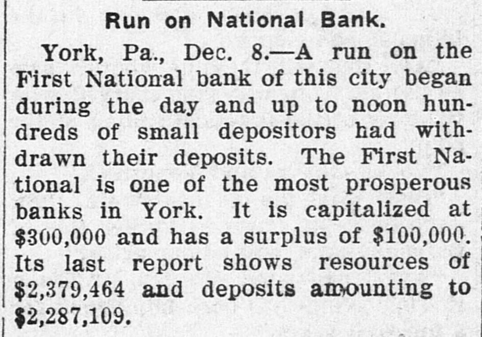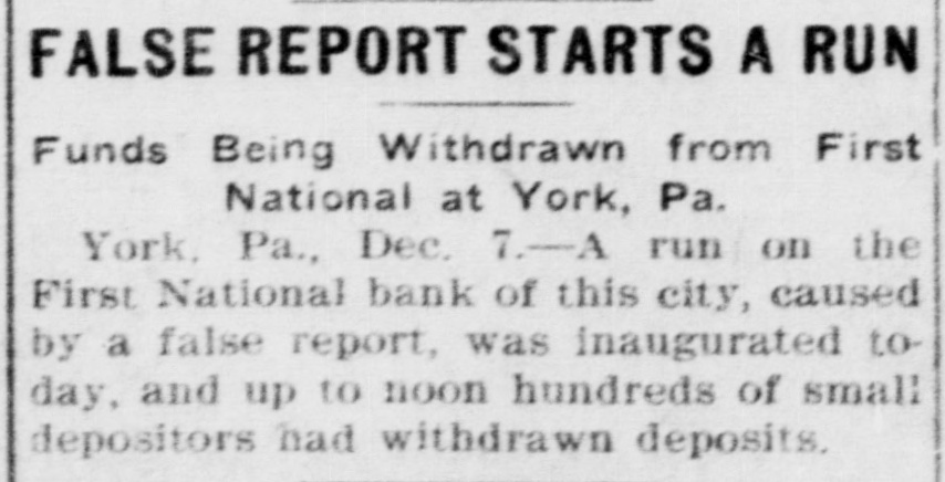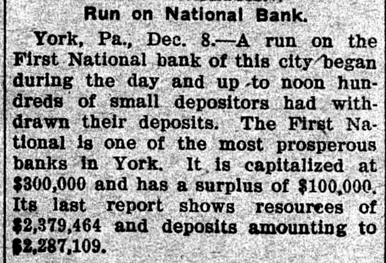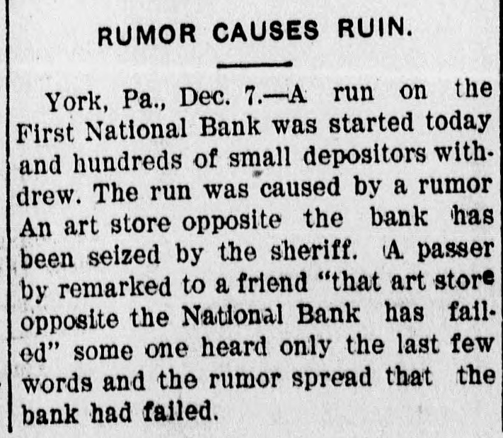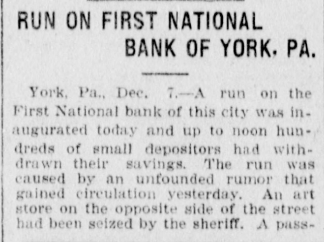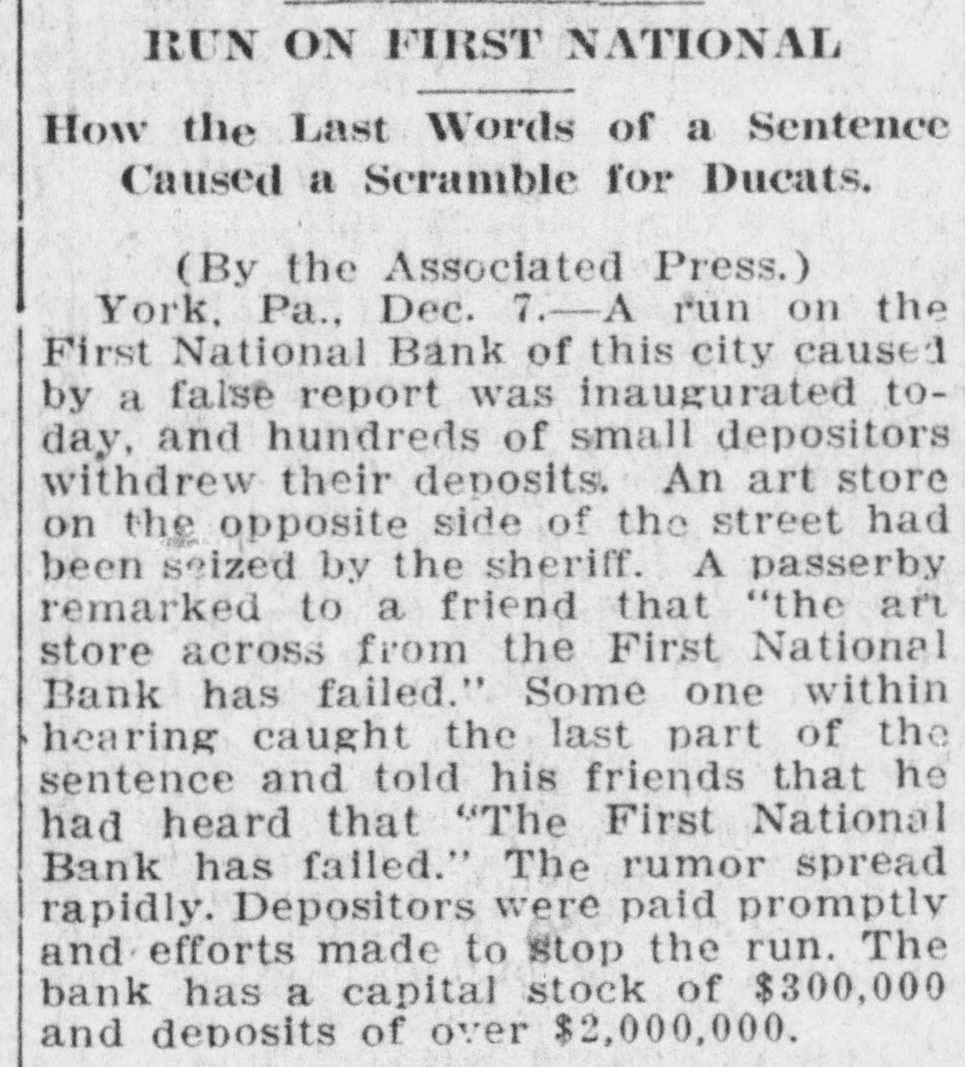 RUN ON FIRST NATIONAL How the Last Words of a Sentence Caused a Scramble for Ducats. (By the Associated Press.) York, Pa., Dec. 7.-A run on the First National Bank of this city caused by a false report was inaugurated today, and hundreds of small depositors withdrew their deposits. An art store on the opposite side of the street had been seized by the sheriff. A passerby remarked to a friend that "the an store across from the First National Bank has failed." Some one within hearing caught the last part of the sentence and told his friends that he had heard that "The First National Bank has failed." The rumor spread rapidly. Depositors were paid promptly and efforts made to stop the run. The bank has a capital stock of $300,000 and deposits of over $2,000,000.