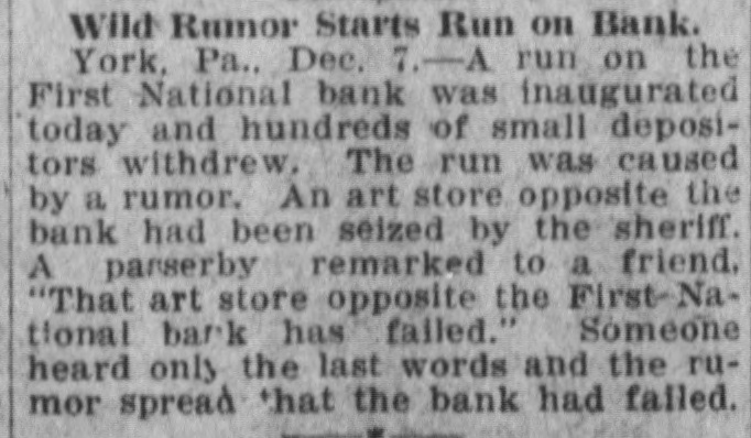 Wild Rumor Starts Run on Bank. York, Pa., Dec. 7.-A run on the First National bank was inaugurated today and hundreds of small depositors withdrew. The run was caused by a rumor. An art store opposite the bank had been seized by the sheriff. A passerby remarked to a friend. "That art store opposite the First-National bark has falled." Someone heard only the last words and the rumor spread that the bank had failed.