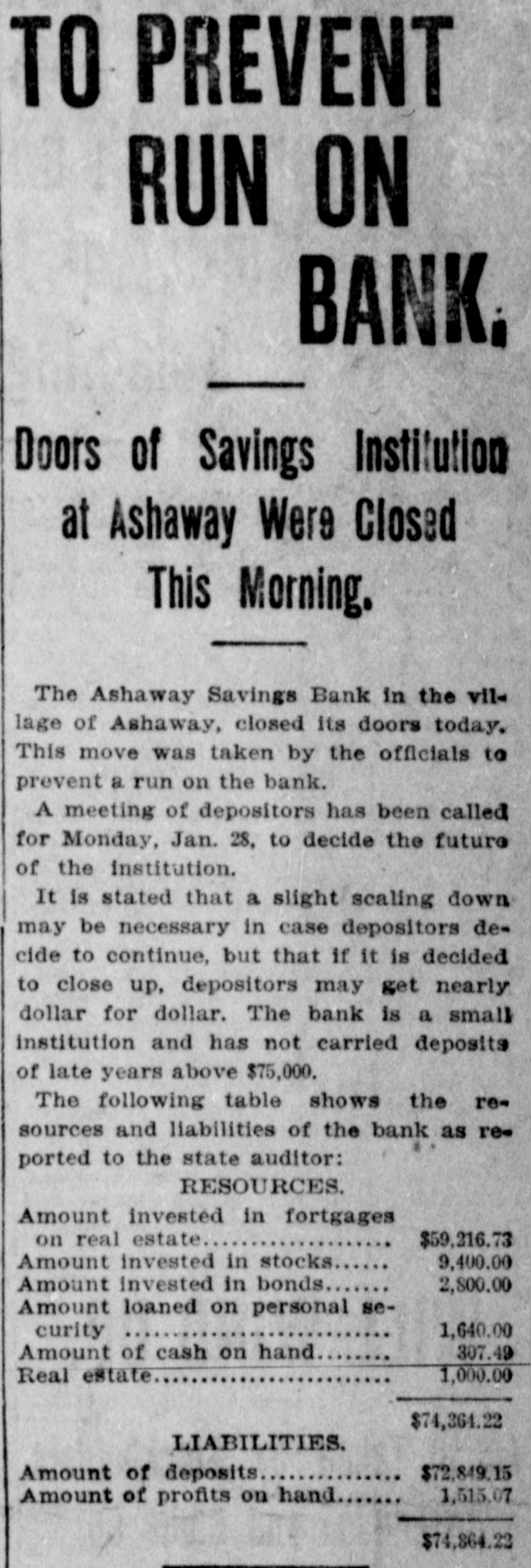 TO PREVENT RUN ON BANK. Doors of Savings Institution at Ashaway Were Closed This Morning. The Ashaway Savings Bank in the village of Ashaway, closed its doors today. This move was taken by the officials to prevent a run on the bank. A meeting of depositors has been called for Monday, Jan. 28, to decide the future of the institution. It is stated that a slight scaling down may be necessary in case depositors decide to continue, but that if it is decided to close up, depositors may get nearly dollar for dollar. The bank is a small institution and has not carried deposits of late years above $75,000. The following table shows the resources and liabilities of the bank as reported to the state auditor: RESOURCES. Amount invested in fortgages on real estate $59,216.73 Amount invested in stocks 9,400.00 Amount invested in bonds 2,800.00 Amount loaned on personal security 1,640.00 Amount of cash on hand 307.49 Real estate 1,000.00 $74,364.22 LIABILITIES. $72,849.15 Amount of deposits 1,515.07 Amount of profits on hand $74,864.23