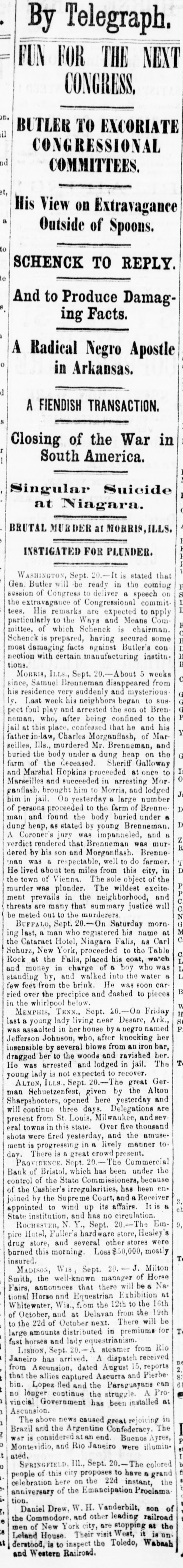 By Telegraph. FOR THE NEXT CONGRESS. BUTLER TO EXCORIATE CO GRESSIONAL COMMITTEES. His View on Extravagance Outside of Spoons. SCHENCK TO REPLY. And to Produce Damaging Facts. Radical Negro Apostle in Arkansas. A FIENDISH TRANSACTION. Closing of the War in South America. Singular Suicide at Niagara. BRUTAL MURDER at MORRIS, ILLS. INSTIGATED FOR PLUNDER. is stated Sept. WASHINGTON, that Gen. Butler will be ready in the coming session of Congress to deliver speech the extravagance of Congressional commit tees. His remarks are expected to apply particularly to the Ways and Means Committee. of which Schenck is chairman. Schencle is prepared, having secured some most damaging facts against Butler's con nection with certain manufacturing institu tions. MORRIS, ILLS., Sept. 20 About 5 since, Samuel Brenneman disappeared from his residence very suddenly and mysterious Last his neighbors began to pect and arrested the son of Bren neman. after being confined to the that he and his Charles Morganflash, of Mar murdered Mr. Brenneman, and buried the body under dung heap on the farm of the deceased. Sheriff Galloway and Marshal Hopkins proceeded at once to Marseilles and succeeded in arresting Mor ganflash. brought him to Morris, and lodged jail. On yesterday large number of him persons proceeded to the farm of Brenne man and found the body buried under A dung heap, as stated by young Brenneman. and was jury Coroner's impanneled, verdict rendered that Brenneman was mur dered by his son and Morganflash. Brenne nao respectable, well to do farmer He lived about ten miles from this city, in the town of Vienna. The sole object of the murder was plunder. The wildest excitement prevails in the neighborhood, and will threats are many that summary justice be meted out to the murderers BUFFALO, Sept. On Saturday morning last, man who registered his name at Carl the Cataract Hotel, Niagara Falls, as Schurz, New York, proceeded to the Table of in Rock at the Falls, placed his coat, who watch boy and charge money and standing the soon feet car brink. from the precipice and dashed to pieces whirlpool MEMPHIS, TENN., Sept. On Friday young Indy living near Desare, assaulted in her house by negro named Jefferson Johnson, who, after knocking her insensible by several blows from an iron bar, dragged her to the woods and ravished The her He was arrested and lodged in jail. young lady not expected to recover. ALTON, ILLS, Sept. he great Ger man Schuetzenfest, given by the Alton Sharpshooters, opened here yesterday and will continue three days. Delegations Are from St Louis, Milwaukee, and sev present eral towns state. Over five thousand shots fired yesterday, and the amuse- to progressing in a lively manner crowd present. day. PROVIDENCE, Sept. 20 The Commercial the Bank of Bristol, which has been under control of the State Commissioners, because of the Cashier's irregularities, has been Receiver en joined the Supreme Court, and appointed to wind up its affairs. State institution. and has no circulation EmROCHESTER, Y., Sept. Hotel, Fuller's hardware store, Healey's were pire drug store, and several other stores barned this morning. Loss $50,000, mostly T insured. Milton MADISON, of Horse the manager well-known Smith, Fairs, announces that Na tional Horse and Equestrian Exhibition 16th at Whitewater, Wis., from the 12th to the 19th of October, and at Delavan from the will be the of October next. There distributed in premiums for Rio and lady equestrianism. from steamer LISBON, A dispatch Janeiro from dated August 15, reports Pierbethat captured Ascurra and bin. Lopez and the Paraguayans Pro- can no the longer struggle. vincial Government has been installed at Ascunsion. The above news caused great in Brazil and the Argentine Confederacy. The considered end Buenoa Montevidio, and Rio Janeiro were illumin= ated. SPRINGFIELD III., Sept. 20 The colored of this city proposes to have grand the celebration people here on the 22d instant, anniversary of the Emancipation Proclama tion. Daniel Drew, W. H. Vanderbilt, son of the Commodore and other leading railroad men of New York city, are stopping at the Leland House Their visit West, it is understood, is to inspect the Toledo, Wabash and Western Railroad.