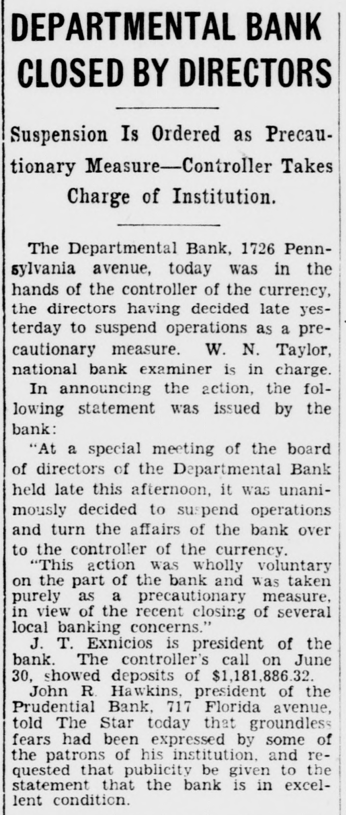 DEPARTMENTAL BANK CLOSED BY DIRECTORS Suspension Is Ordered as Precautionary Measure-Controller Takes Charge of Institution. The Departmental Bank, 1726 Pennsylvania avenue, today was in the hands of the controller of the currency, the directors having decided late yesterday to suspend operations as a precautionary measure. W. N. Taylor, national bank examiner is in charge. In announcing the action, the following statement was issued by the bank: "At a special meeting of the board of directors of the Departmental Bank held late this afternoon, it was unanimously decided to suspend operations and turn the affairs of the bank over to the controller of the currency. "This action was wholly voluntary on the part of the bank and was taken purely as a precautionary measure, in view of the recent closing of several local banking concerns." J. T. Exnicios is president of the bank. The controller's call on June 30, showed deposits of $1,181,886.32. John R. Hawkins, president of the Prudential Bank, 717 Florida avenue, told The Star today that groundless fears had been expressed by some of the patrons of his institution, and requested that publicity be given to the statement that the bank is in excellent condition.