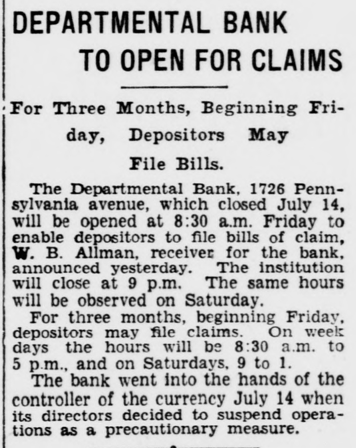 DEPARTMENTAL BANK TO OPEN FOR CLAIMS For Three Months, Beginning Friday, Depositors May File Bills. The Departmental Bank, 1726 Pennsylvania avenue, which closed July 14, will be opened at 8:30 a.m. Friday to enable depositors to file bills of claim, W. B. Allman, receiver for the bank, announced yesterday. The institution will close at 9 p.m. The same hours will be observed on Saturday. For three months, beginning Friday. depositors may file claims. On week days the hours will be 8:30 a.m. to 5 p.m., and on Saturdays, 9 to 1. The bank went into the hands of the controller of the currency July 14 when its directors decided to suspend operations as a precautionary measure.