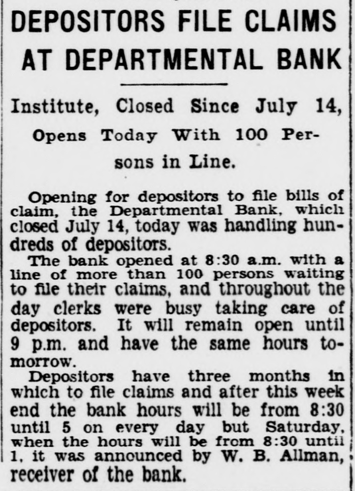 DEPOSITORS FILE CLAIMS AT DEPARTMENTAL BANK Institute, Closed Since July 14, Opens Today With 100 Persons in Line. Opening for depositors to file bills of claim, the Departmental Bank, which closed July 14, today was handling hundreds of depositors. The bank opened at 8:30 a.m. with a line of more than 100 persons waiting to file their claims, and throughout the day clerks were busy taking care of depositors. It will remain open until 9 p.m. and have the same hours tomorrow. Depositors have three months in which to file claims and after this week end the bank hours will be from 8:30 until 5 on every day but Saturday, when the hours will be from 8:30 until 1. it was announced by W. B. Allman, receiver of the bank.