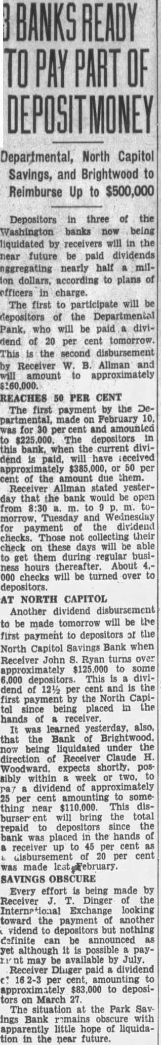 Two Washington banks, closed before the Roosevelt bank holiday, will begin paying depositors part of their savings today. They are the Departmental Bank and the North Capitol Sevings Bank, the receivers of which, through process of liquidation, gradually have been liquidating the assets. 20 PER CENT DIVIDEND The Departmental Bank, which has been the hands Receiver W. Allman, will pay 20 per cent dividend on deposits. This will amount to about $160,000. will be the second dividend paid on deposits by the Departmental, 30 per cent distribution been made last February. That released Thus with the dividend now about to paid, the Departmental will have turned back to depositors per cent of their deposits, About 4,000 depositors will receive dividend checks. These will be distributed from 8:30 to o'clock morning, and in the same period tomorrow day mornings. Those failing them at that time may call during regular business hours thereafter. The North Capitol Savings Bank, which being liquidated Receiver John S. Ryan, today will begin paying out $125,000, which on first since the bank closed. About 6,000 depositors will share. NEW DIVIDEND DUE The Bank of Brightwood now being by Receiver Claude H. Woodward. expected pay within two weeks dividend 25 per cent on deposits, which will mean the releasing of about This will bring the total of dividend to 45 per cent, 20 per cent dividend having been paid in February. Meanwhile, the thousands of positors whose money became tied when 13 banks failed open after Roosevelt holiday, are anxiously awaiting some word the Treasury Department. In the banking world. all signs point to huge merger