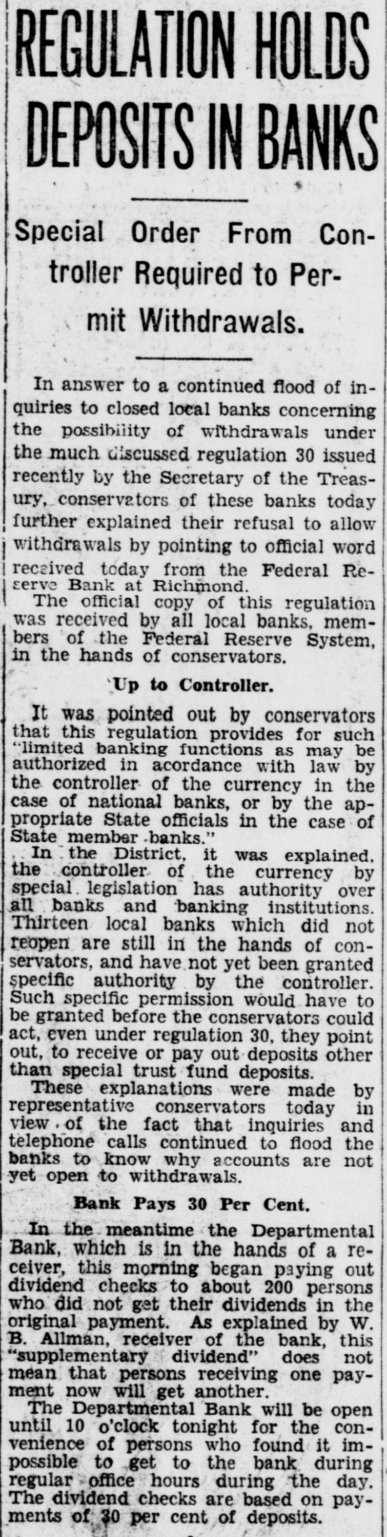 REGULATION HOLDS DEPOSITS IN BANKS Special Order From Controller Required to Permit Withdrawals. In answer to a continued flood of inquiries to closed local banks concerning the possibility of withdrawals under the much discussed regulation 30 issued recently by the Secretary of the Treasury, conservators of these banks today further explained their refusal to allow withdrawals by pointing to official word received today from the Federal Reserve Bank at Richmond. The official copy of this regulation was received by all local banks, members of the Federal Reserve System, in the hands of conservators. Up to Controller. It was pointed out by conservators that this regulation provides for such "limited banking functions as may be authorized in acordance with law by the controller of the currency in the case of national banks, or by the appropriate State officials in the case of State member banks." In the District, it was explained, the controller of the currency by special legislation has authority over all banks and banking institutions. Thirteen local banks which did not reopen are still in the hands of conservators, and have not yet been granted specific authority by the controller. Such specific permission would have to be granted before the conservators could act, even under regulation 30, they point out, to receive or pay out deposits other than special trust fund deposits. These explanations were made by representative conservators today in view of the fact that inquiries and telephone calls continued to flood the banks to know why accounts are not yet open to withdrawals. Bank Pays 30 Per Cent. In the meantime the Departmental Bank, which is in the hands of a receiver, this morning began paying out dividend checks to about 200 persons who did not get their dividends in the original payment. As explained by W. B. Allman, receiver of the bank, this "supplementary dividend" does not mean that persons receiving one payment now will get another. The Departmental Bank will be open until 10 o'clock tonight for the convenience of persons who found it impossible to get to the bank during regular office hours during the day. The dividend checks are based on payments of 30 per cent of deposits.