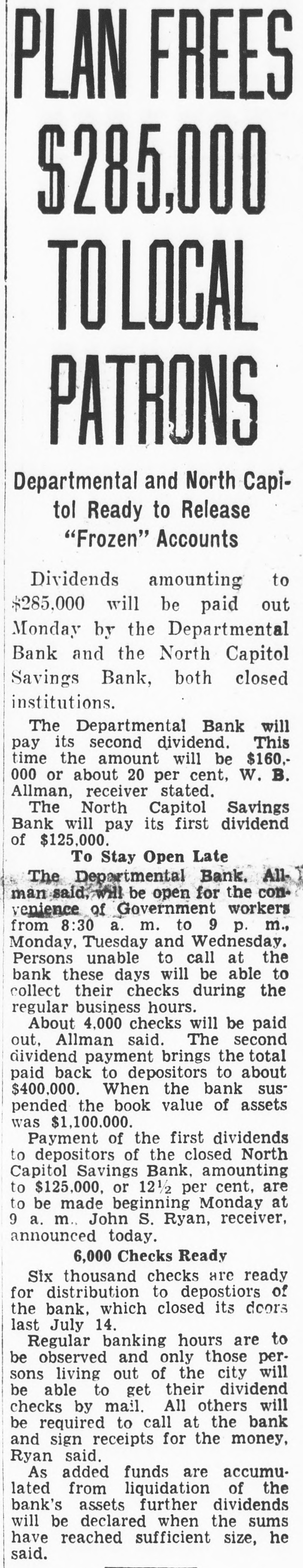 FREES PLAN $285,000 TO LOCAL PATRONS Departmental and North Capitol Ready to Release "Frozen" Accounts Dividends amounting to $285,000 will be paid out Monday by the Departmental Bank and the North Capitol Savings Bank, both closed institutions. The Departmental Bank will pay its second dividend. This time the amount will be $160,000 or about 20 per cent, W. B. Allman, receiver stated. The North Capitol Savings Bank will pay its first dividend of $125,000. To Stay Open Late The Departmental Bank. Allman said,will be open for the convenience of Government workers from 8:30 a. m. to 9 p. m., Monday, Tuesday and Wednesday. Persons unable to call at the bank these days will be able to collect their checks during the regular business hours. About 4.000 checks will be paid out, Allman said. The second dividend payment brings the total paid back to depositors to about $400,000. When the bank suspended the book value of assets was $1,100,000. Payment of the first dividends to of the depositors closed North Capitol Savings Bank, amounting to $125,000, or 12 1/2 per cent, are to be made beginning Monday at 9 a. m.. John S. Ryan, receiver, announced today. 6,000 Checks Ready Six thousand checks are ready for distribution to depostiors of the bank, which closed its dcors last July 14. Regular banking hours are to be observed and only those persons living out of the city will be able to get their dividend checks by mail. All others will be required to call at the bank and sign receipts for the money, Ryan said. As added funds are accumulated from liquidation of the bank's assets further dividends will be declared when the sums have reached sufficient size, he said.