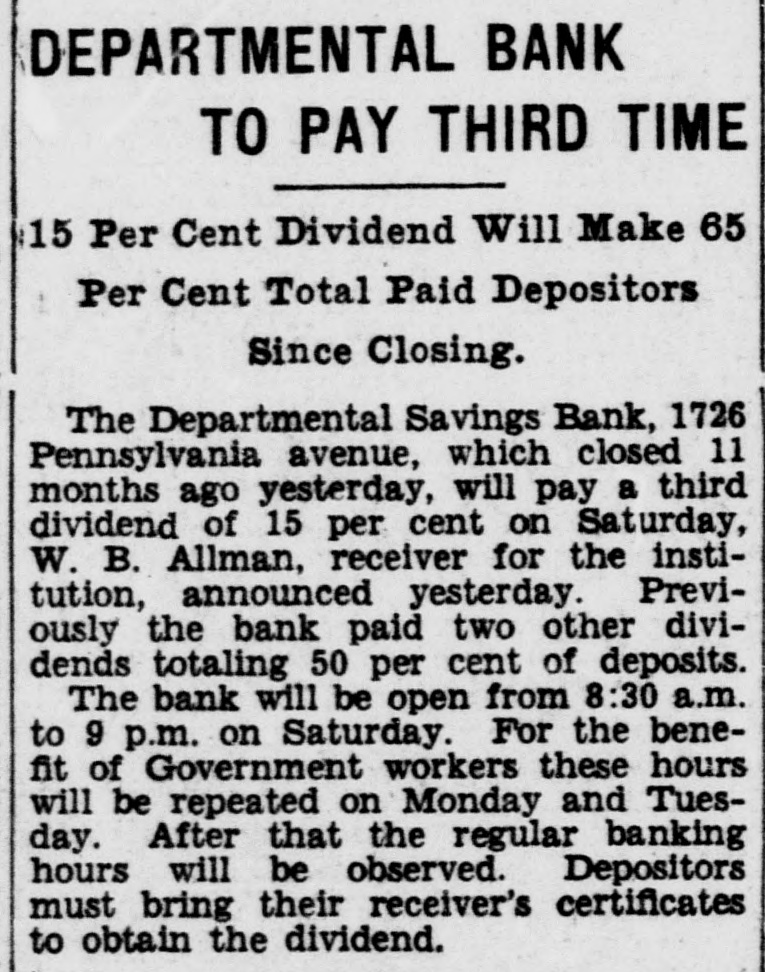 DEPARTMENTAL BANK TO PAY THIRD TIME 15 Per Cent Dividend Will Make 65 Per Cent Total Paid Depositors Since Closing. The Departmental Savings Bank, 1726 Pennsylvania avenue, which closed 11 months ago yesterday, will pay a third dividend of 15 per cent on Saturday, W. B. Allman, receiver for the institution, announced yesterday. Previously the bank paid two other dividends totaling 50 per cent of deposits. The bank will be open from 8:30 a.m. to 9 p.m. on Saturday. For the benefit of Government workers these hours will be repeated on Monday and Tuesday. After that the regular banking hours will be observed. Depositors must bring their receiver's certificates to obtain the dividend.