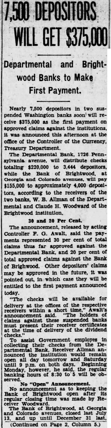 Depositors in two of the four Washington banks closed July order the Comptroller of the Currency able to their "dividend" checks today, according information given out by the Comptroller's of fice. The which have been in charge of receivers are the Bank of and the Departmental Bank About 7,500 depositors in the two banks will benefit the disbursement which will about PAYMENT AT BANKS According to office of the Comptroller the "dividend" be paid by the Departmental Bank will amount to 30 cent. while the disbursement by the Bank of Brightwood will be 20 per cent. Holders of claims against these banks must present their ceivers at the time payment made. that depositors will have to call the banks for their checks. Claude Woodward, the Bank of Brightwood. stated that institution would open at 8:30 today, tomorrow and Monday and remain open until days for convenience of those will receive their the Departmental Bank. Receiver B Allman stated that the bank would open at to day, and Saturday and remain open until and that next week the bank would be open for payments from 8:30 until Neither of the institutions had received loans from the Reconstruction Finance Corporation as had the other closed Washington banks. the International Exchange and the North Capitol of condition of the Bank of issued few days Receiver Woodward gave total assets accounted for as with total liabilities accounted for of Total collections from assets were reported as this figure added from stock assessment This stock assessment was made necesary, reported. because the deficiency was determined to be excess of the capital the bank. The receiver has collected cash Cash in the hands of the receiver and Comp troller amounts Secured and preferred liabilities paid amount Advances for protection assets. amount to and penses of receivership ported as Receiver Allman of the Departmental. and Claude H. Woodward. of the Brightwood in stitution. additional payments will be made soon assets are liquidated and claims proven.