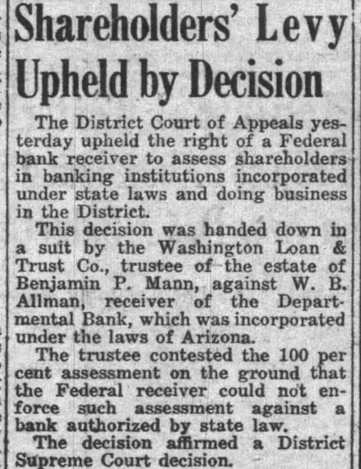 BANK INVESTORS GET DEFICIT BILL Shareholders Ordered to Meet Assessments for Departmental November 25. W. B. Allman, receiver for the Departmental Bank, 1726 Pennsylvania avenue, which suspended. operations July 15 last, issued a call to shareholders of the institution today to arrange for payment of 100 per cent assessments on or before November 25. The assessment on the shareholders was levied October 18 under authority of the controller of currency of the Federal Government, and was made for the protection of the depositors of the bank. Assessments Total $106,060. There are approximately 3,000 shareholders affected by the order, and their assessments aggregate approximately $106,060. The full payment of the assessments is due November 25. For the convenience of shareholders employed during the regular hours of the day, the bank will remain open until 10 p.m. November 25. While full payment of the assessment is due next week, shareholders, by signing an agreement before November 25, are given the right to make the payments in four monthly installments, ending February 25, Mr. Allman said. The Departmental Bank operated under a charter granted by the State of Arizona, but was subject to the rules of the National Banking Association and under the control of the Federal controller of the currency. Depositors File Claims. The shareholders of the institution were subject to double liability in case of failure of the bank. A statement of the condition of the bank for the quarter year ended September 30 showed the total of all assets coming into the hands of the receiver up to that date amounted to $1,118,867.65. The total assets uncollected up to that date were $949,606.82 and the total of all liabilities was $906,937.20, while cash on hand at that time totaled $121,041.51. Depositors are being given an opportunity to file claims for payment by the institution.