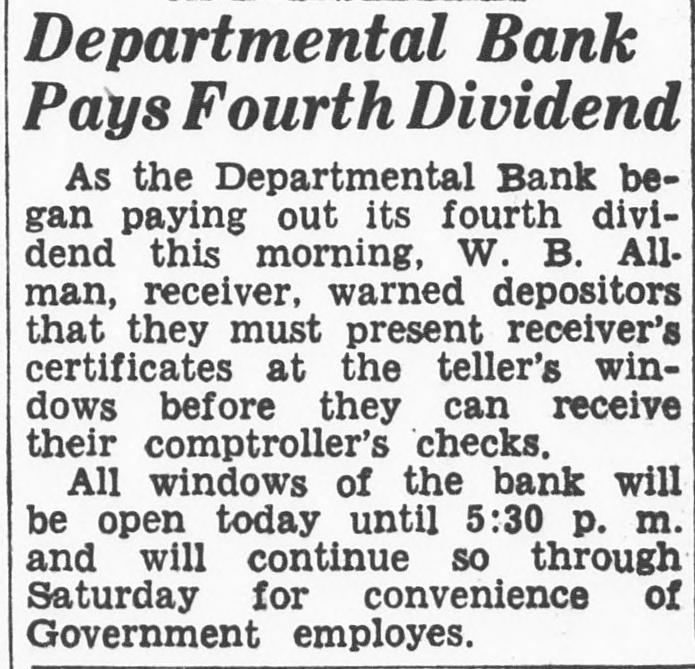 Departmental Bank Pays Fourth Dividend As the Departmental Bank began paying out its fourth dividend this morning, W. B. Allman, receiver, warned depositors that they must present receiver's certificates at the teller's windows before they can receive their comptroller's checks. All windows of the bank will be open today until 5:30 p. m. and will continue so through Saturday for convenience of Government employes.
