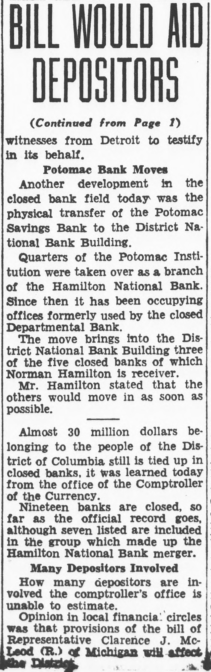 BILL WOULD AID DEPOSITORS (Continued from Page 1) witnesses from Detroit to testify in its behalf. Potomac Bank Moves Another development in the closed bank field today was the physical transfer of the Potomac Savings Bank to the District National Bank Building. Quarters of the Potomac Institution were taken over as a branch of the Hamilton National Bank. Since then it has been occupying offices formerly used by the closed Departmental Bank. The move brings into the District National Bank Building three of the five closed banks of which Norman Hamilton is receiver. Mr. Hamilton stated that the others would move in as soon as possible. Almost 30 million dollars belonging to the people of the District of Columbia still is tied up in closed banks, it was learned today from the office of the Comptroller of the Currency. Nineteen banks are closed, so far as the official record goes, although seven listed are included in the group which made up the Hamilton National Bank merger. Many Depositors Involved How many depositors are involved the comptroller's office is unable to estimate. Opinion in local financia circles was that provisions of the bill of Representative Clarence J. McLeod (R.) of Michigan will affect District the