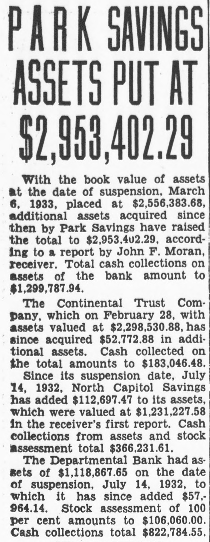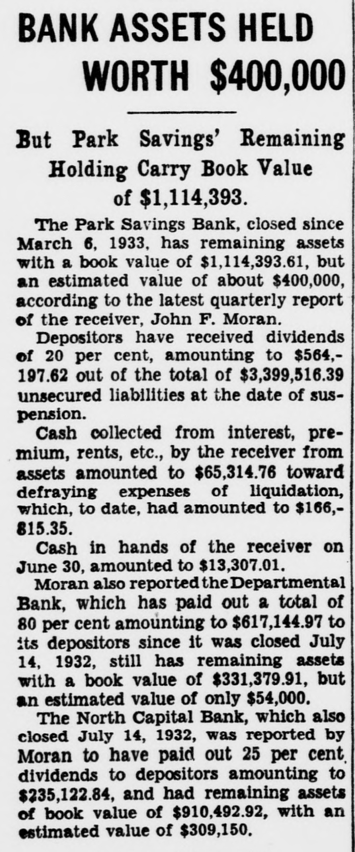 BANK ASSETS HELD WORTH $400,000 But Park Savings' Remaining Holding Carry Book Value of $1,114,393. The Park Savings Bank, closed since March 6, 1933, has remaining assets with a book value of $1,114,393.61, but an estimated value of about $400,000, according to the latest quarterly report of the receiver, John F. Moran. Depositors have received dividends of 20 per cent, amounting to $564,197.62 out of the total of $3,399,516.39 unsecured liabilities at the date of suspension. Cash collected from interest, premium, rents, etc., by the receiver from assets amounted to $65,314.76 toward defraying expenses of liquidation, which, to date, had amounted to $166,815.35. Cash in hands of the receiver on June 30, amounted to $13,307.01. Moran also reported the Departmental Bank, which has paid out a total of 80 per cent amounting to $617,144.97 to its depositors since it was closed July 14, 1932, still has remaining assets with a book value of $331,379.91, but an estimated value of only $54,000. The North Capital Bank, which also closed July 14, 1932, was reported by Moran to have paid out 25 per cent dividends to depositors amounting to $235,122.84, and had remaining assets of book value of $910,492.92, with an estimated value of $309,150.