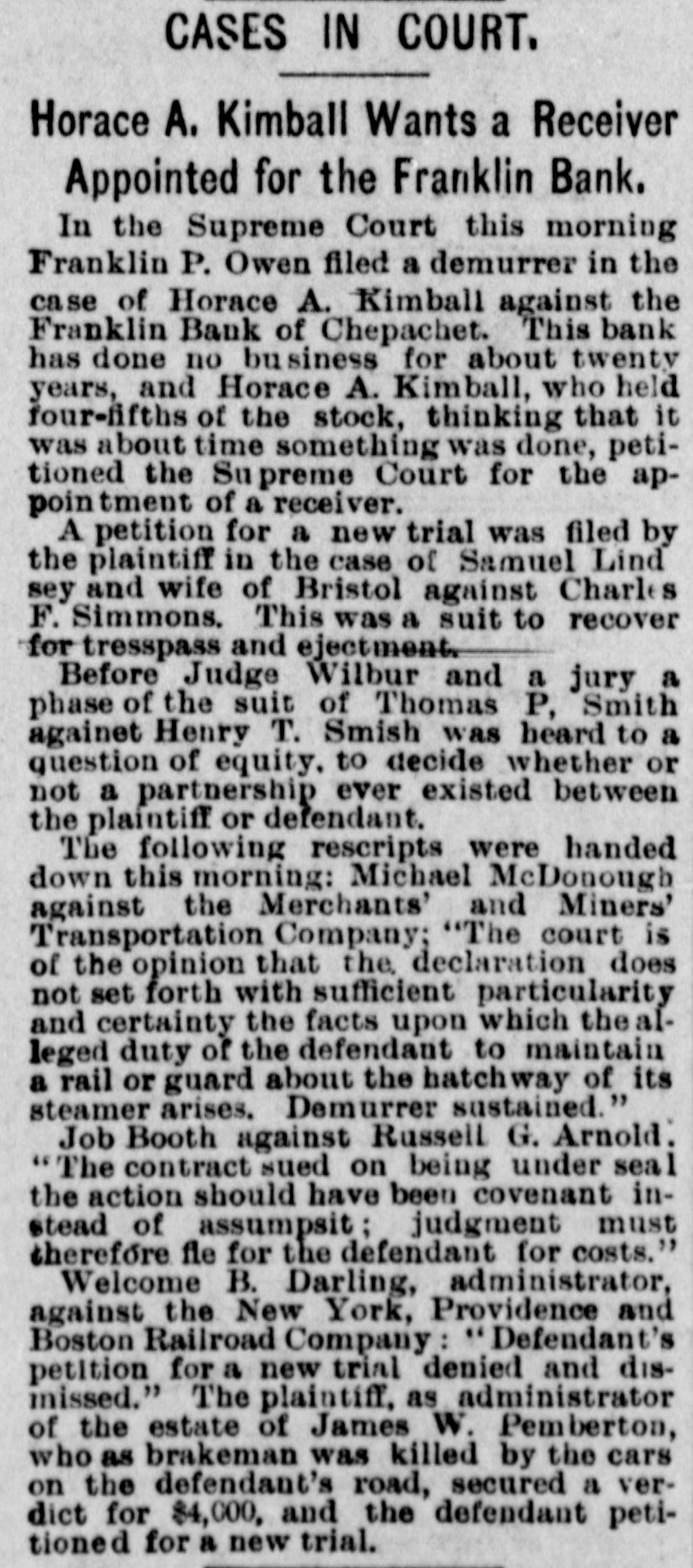 CASES IN COURT. Horace A. Kimball Wants a Receiver Appointed for the Franklin Bank. In the Supreme Court this morning Franklin P. Owen filed a demurrer in the case of Horace A. Kimball against the Franklin Bank of Chepachet. This bank has done no business for about twenty years, and Horace A. Kimball, who held four-fifths of the stock, thinking that it was about time something was done, petitioned the Supreme Court for the appointment of a receiver. A petition for a new trial was filed by the plaintiff in the case of Samuel Lind sey and wife of Bristol against Charle F. Simmons. This was a suit to recover for tresspass and ejectment. Before Judge Wilbur and a jury a phase of the suit of Thomas P, Smith againet Henry T. Smish was heard to a question of equity, to decide whether or not a partnership ever existed between the plaintiff or defendant. The following rescripts were handed down this morning: Michael McDonough against the Merchants' and Miners' Transportation Company; "The court is of the opinion that the, declaration does not set forth with sufficient particularity and certainty the facts upon which thealleged duty of the defendant to maintain a rail or guard about the hatchway of its steamer arises. Demurrer sustained." Job Booth against Russell G. Arnold. "The contract sued on being under seal the action should have been covenant instead of assumpsit; judgment must therefore fle for the defendant for costs.' Welcome B. Darling, administrator, against the New York, Providence and Boston Railroad Company: Defendant's petition for a new trial denied and dismissed." The plaintiff, as administrator of the estate of James W. Pemberton, who as brakeman was killed by the cars on the defendant's road, secured a verdict for $4,000, and the defendant petitioned for a new trial.