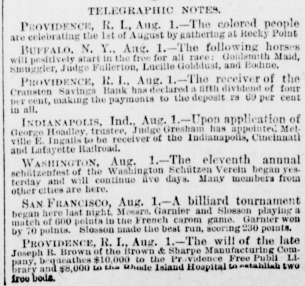 TELEGRAPHIC NOTES. PROVIDENCE, R. I., Aug. 1. - -The colored people are celebrating the 1st of August by gathering at Rocky Point BUFFALO. N. Y., Ang. 1.-The following horses will positively start in the free for all race: Goldsmith Maid, Smuggler, Judge Fullerton, Lucille Golddust, and Bodine. PROVIDENCE, R. I., Aug. 1.-The receiver of the Cranston Savings Bank has declared a fifth dividend of four per cent, making the payments to the deposit rs 69 per cent in all. INDIANAPOLIS, Ind., Aug. 1.-Upon application of George Hoadley, trustee, Judge Gresham has appointed Met. ville E. Ingalls to be receiver of the Indianapolis, Cincinnati and Lafayette Railroad. WASHINGTON, Aug. 1. - The eleventh annual schiltzenfest of the Washington Schützen Verein began yesterday and will continue five days. Many members from other cities are here. SAN FRANCISCO, Aug. 1.-A billiard tournament began here last night, Messrs. Garnier and Slosson playing a match of 600 points in the French carom game. Garnier won by 70 points. Slesson made the best run, scoring 230 points. PROVIDENCE, R. I., Aug. 1.-The will of the late Joseph R. Brown of the Brown & Sharpe Manufacturing Company, bequeathes $10,000 to the Providence Free Public Library and $8,000 to the whode Island Hospital 3 eatahliah two free bods.