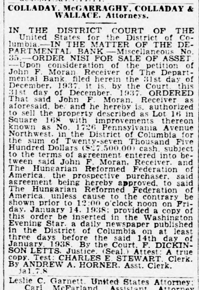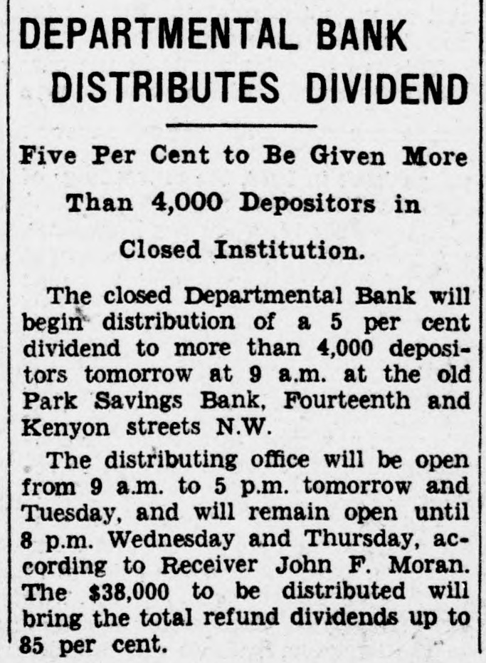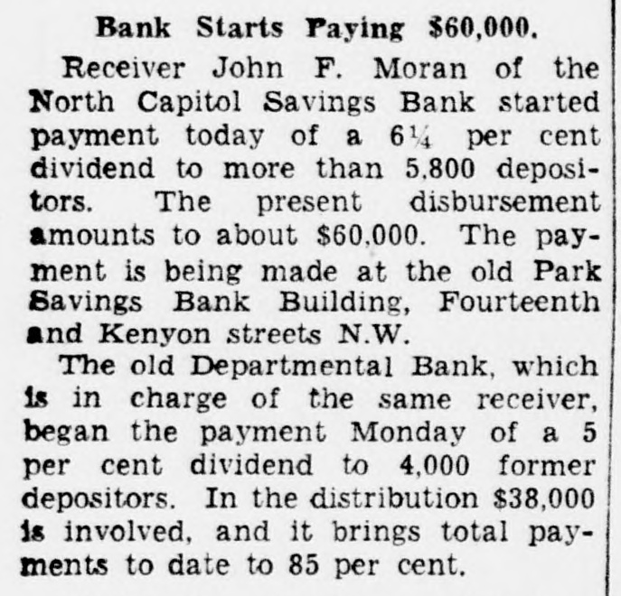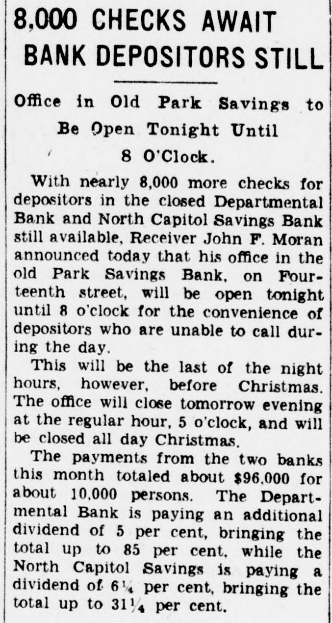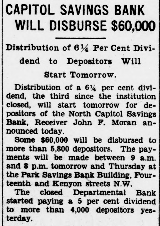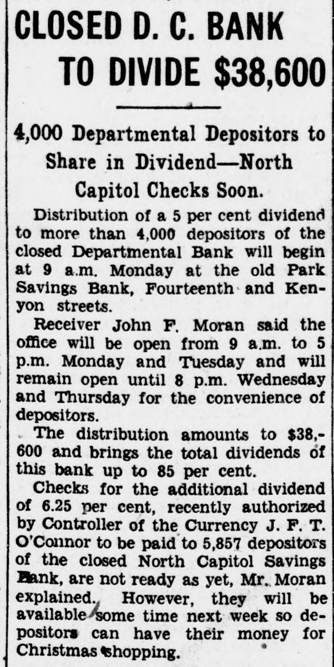 2 CLOSED BANKS WILL PAY $96,000 North Capitol Savings and Departmental to Give Dividends Soon. Payment, probably before Christmas, of about $96,000 in additional dividends to depositors of two closed banks-North Capitol Savings Bank and the Departmental Bank-was authorized today by Controller of the Currency J. F. T. O'Connor. In making formal announcement the controller said "actual distribution to creditors of dividend funds involved will be made as soon as possible, although due to the time required for preparation of dividend checks the exact date of distribution cannot be stated at this time." The receiver of both banks, John F. Moran, whose offices are in the old closed Park Savings Bank on Fourteenth street N.W., was authorized by the controller to proceed with payment. In the North Capitol Savings Bank there will be a third dividend amounting to 6.25 per cent to creditors. This dividend will effect a distribution of $57,700 to 5,857 claimants. As this receivership already has paid dividends of 25 per cent, the total payments will now aggregate 31.25 per cent. Depositors of this bank have filed claim against the institution for a total of $940,000. Receiver Moran will pay to depositors of the Departmental Bank a sixth dividend of 5 per cent. This will amount to $38,600 to 4,029 claimants who have proved claims aggregating $772,000. As this receivership has paid dividends of 30 per cent already, the Christmas dividend will bring the total up to 35 per cent. Controller O'Connor explained that Receiver Moran will announce later by publication or by postal card the exact date when dividend checks will be made available. "In the meantime," said Mr. O'Connor in his statement, "it is requested that depositors of the banks involved do not communicate with Receiver Moran by phone or otherwise concern(See BANKS, Page A-3.)