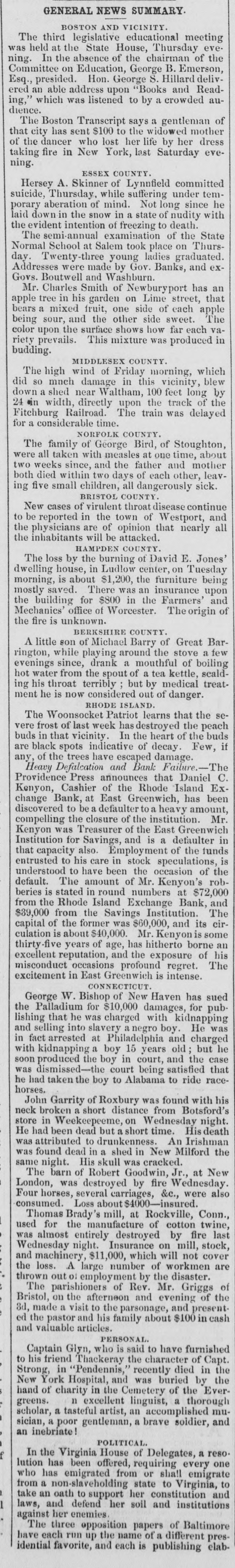 GENERAL NEWS SUMMARY. BOSTON AND VICINITY. The third legislative educational meeting was held at the State House, Thursday eve. ning. In the absence of the chairman of the Committee on Education, George B. Emerson, Esq., presided. Hon. George S. Hillard delivered an able address upon "Books and Reading," which was listened to by a crowded audience. The Boston Transcript says a gentleman of that city has sent $100 to the widowed mother of the dancer who lost her life by her dress taking fire in New York, last Saturday evening. ESSEX COUNTY. Hersey A. Skinner of Lynnfield committed suicide, Thursday, while suffering under temporary aberation of mind. Not long since he laid down in the snow in a state of nudity with the evident intention of freezing to death. The semi-annual examination of the State Normal School at Salem took place on Thursday. Twenty-three young ladies graduated. Addresses were made by Gov. Banks, and exGovs. Boutwell and Washburn. Mr. Charles Smith of Newburyport has an apple tree in his garden on Lime street, that bears a mixed fruit, one side of each apple being sour, and the other side sweet. The color upon the surface shows how far each variety prevails. This mixture was produced in budding. MIDDLESEX COUNTY. The high wind of Friday morning, which did so mnch damage in this vicinity, blew down a shed near Waltham, 100 feet long by 24 ein width, directly upon the track of the Fitchburg Railroad. The train was delayed for a considerable time. NORFOLK COUNTY. The family of George Bird, of Stoughton, were all taken with measles at one time, about two weeks since, and the father and mother both died within two days of each other, leaving five small children, all dangerously sick. BRISTOL COUNTY. New cases of virulent throat disease continue to be reported in the town of Westport, and the physicians are of opinion that nearly all the inhabitants will be attacked. HAMPDEN COUNTY. The loss by the burning of David E. Jones' dwelling house, in Ludlow center, on Tuesday morning, is about $1,200, the furniture being mostly saved. There was an insurance upon the building for $800 in the Farmers' and Mechanics' office of Worcester. Theorigin of the fire is unknown. BERKSHIRE COUNTY. A little son of Michael Barry of Great Barrington, while playing around the stove a few evenings since, drank a mouthful of boiling hot water from the spout of a tea kettle, scalding his throat terribly but by medical treatment he is now considered out of danger. RHODE ISLAND. The Woonsocket Patriot learns that the severe frost of last week has destroyed the peach buds in that vicinity. In the heart of the buds are black spots indicative of decay. Few, if any, of the trees have escaped damage. Heavy Defalcation and Bank Failure.-The Providence Press announces that Daniel C. Kenyon, Cashier of the Rhode Island Exchange Bank, at East Greenwich, has been discovered to be a defaulter to a heavy amount, compelling the closure of the institution. Mr. Kenyon was Treasurer of the East Greenwich Institution for Savings, and is a defaulter in that capacity also. Employment of the funds entrusted to his care in stock speculations, is understood to have been the occasion of the default. The amount of Mr. Kenyon's robberies is stated in round numbers at $72,000 from the Rhode Island Exchange Bank, and $39,000 from the Savings Institution. The capital of the former was $60,000, and its circulation is about $40,000. Mr. Kenyoni is some thirty five years of age, has hitherto borne an excellent reputation, and the exposure of his misconduct occasions profound regret. The excitement in East Greenwich is intense. CONNECTICUT. George W. Bishop of New Haven has sued the Palladium for $10,000 damages, for publishing that he was charged with kidnapping and selling into slavery a negro boy. He was in fact arrested at Philadelphia and charged with kidnapping a boy 15 years old but he soon produced the boy in court, and the case was dismissed-the court being satisfied that he had taken the boy to Alabama to ride racehorses. John Garrity of Roxbury was found with his neck broken a short distance from Botsford's store in Weekeepeeme, on Wednesday night. He had been dead but a short time. His death was attributed to drunkenness. An Irishman was found dead in a shed in New Milford the same night. His skull was cracked. The barn of Robert Goodwin, Jr., at New London, was destroyed by fire Wednesday. Four horses, several carriages, &c., were also consumed. Loss about $4000-insured. Thomas Brady's mill, at Rockville, Conn., used for the manufacture of cotton twine, was almost entirely destroyed by fire last Wednesday night. Insurance on mill, stock, and machinery, $11,000, which will not cover the loss. A large number of workmen are thrown out of employment by the disaster. The parishioners of Rev. Mr. Griggs of Bristol, on the afternoon and evening of the 3d, made a visit to the parsonage, and presented the pastor and his family about $100 in cash and valuable articles. PERSONAL. Captain Glyn, who is said to have furnished to his friend Thackeray the character of Capt. Strong, in "Pendennis," recently died in the New York Hospital, and was buried by the hand of charity in the Cemetery of the Evergreens. n excellent linguist, a thorough scholar, a tasteful artist, an accomplished musician, a poor gentleman, a brave soldier, and an inebriate! POLITICAL. In the Virginia House of Delegates, a reso. lution has been offered, requiring every one who has emigrated from or shall emigrate from a non-slaveholding state to Virginia, to take an oath to support her constitution and laws, and defend her soil and institutions against her enemies. The three opposition papers of Baltimore have each run up the name of a different presidential favorite, and each is publishing elab-